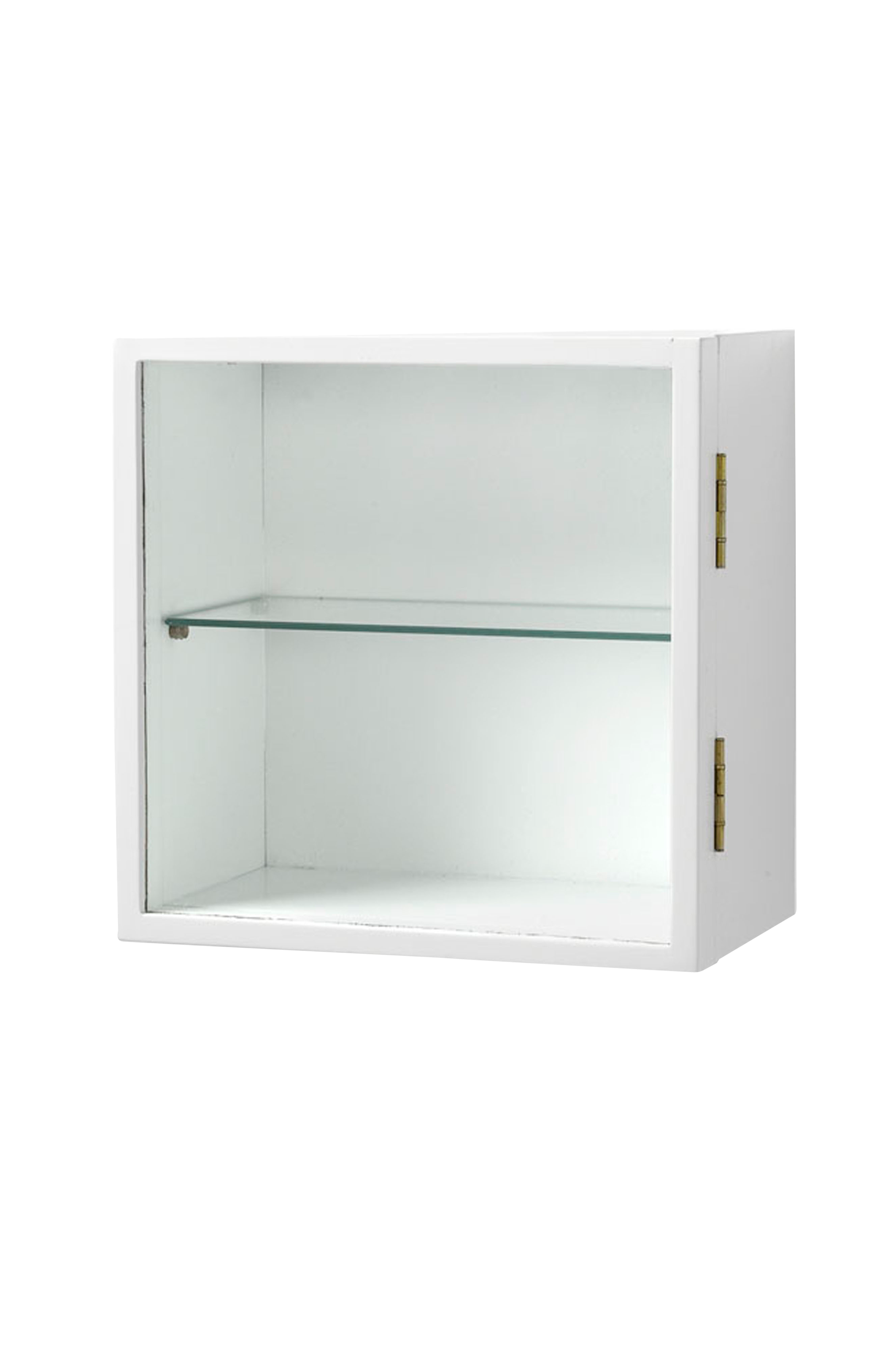 Väggvitrin i oljad ek med 1 st glashyllplan. Bredd 32 cm. Djup 17 cm. Höjd 32 cm. Vikt 4,5 kg.