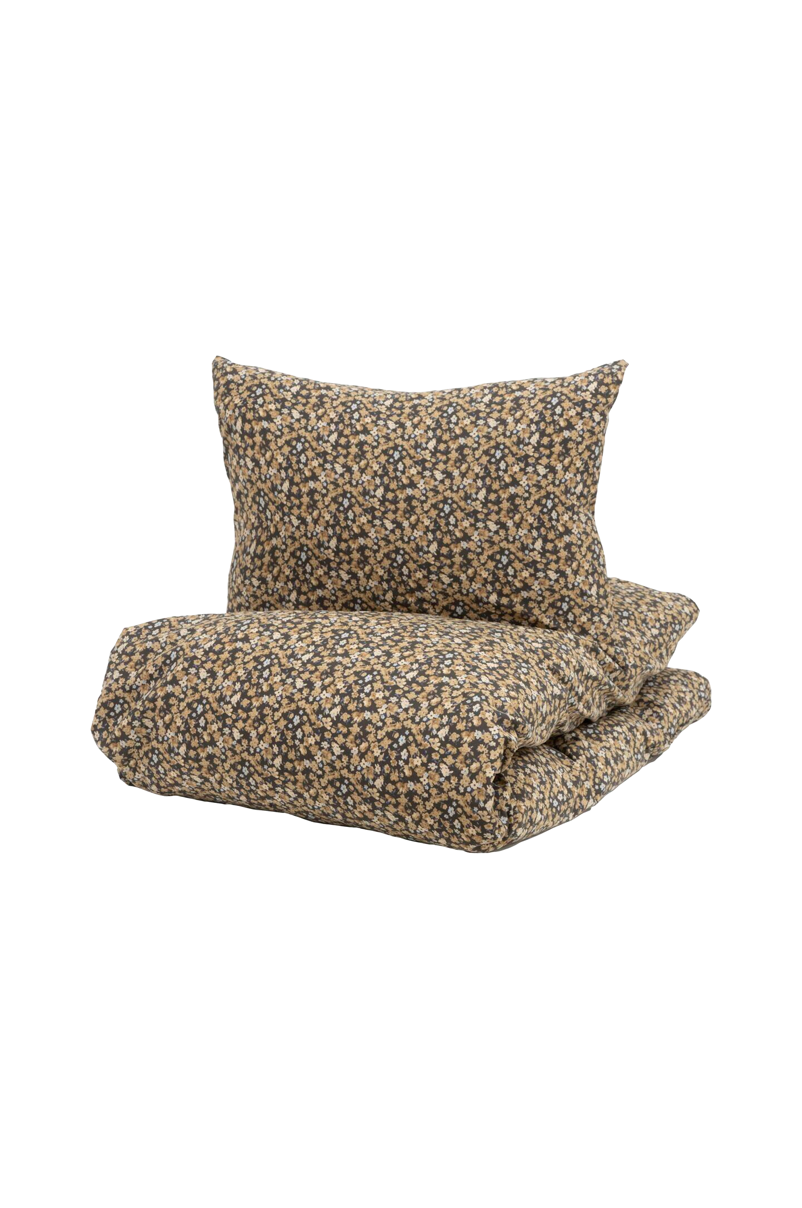 Bäddset i 100 % bomull med småblommigt motiv. Smakfull mörk bottenfärg och blommor i brunt, beige och ljusblått. De fina jordfärgerna ger ro i sovrummet och den extra fina bomullen lång hållbarhet. Det naturliga mönstret skapar lugn och välbehag i sovrummet. Dragkedja i botten av örngott och påslakan och bäddset består av 1 påslakan och 1 örngott