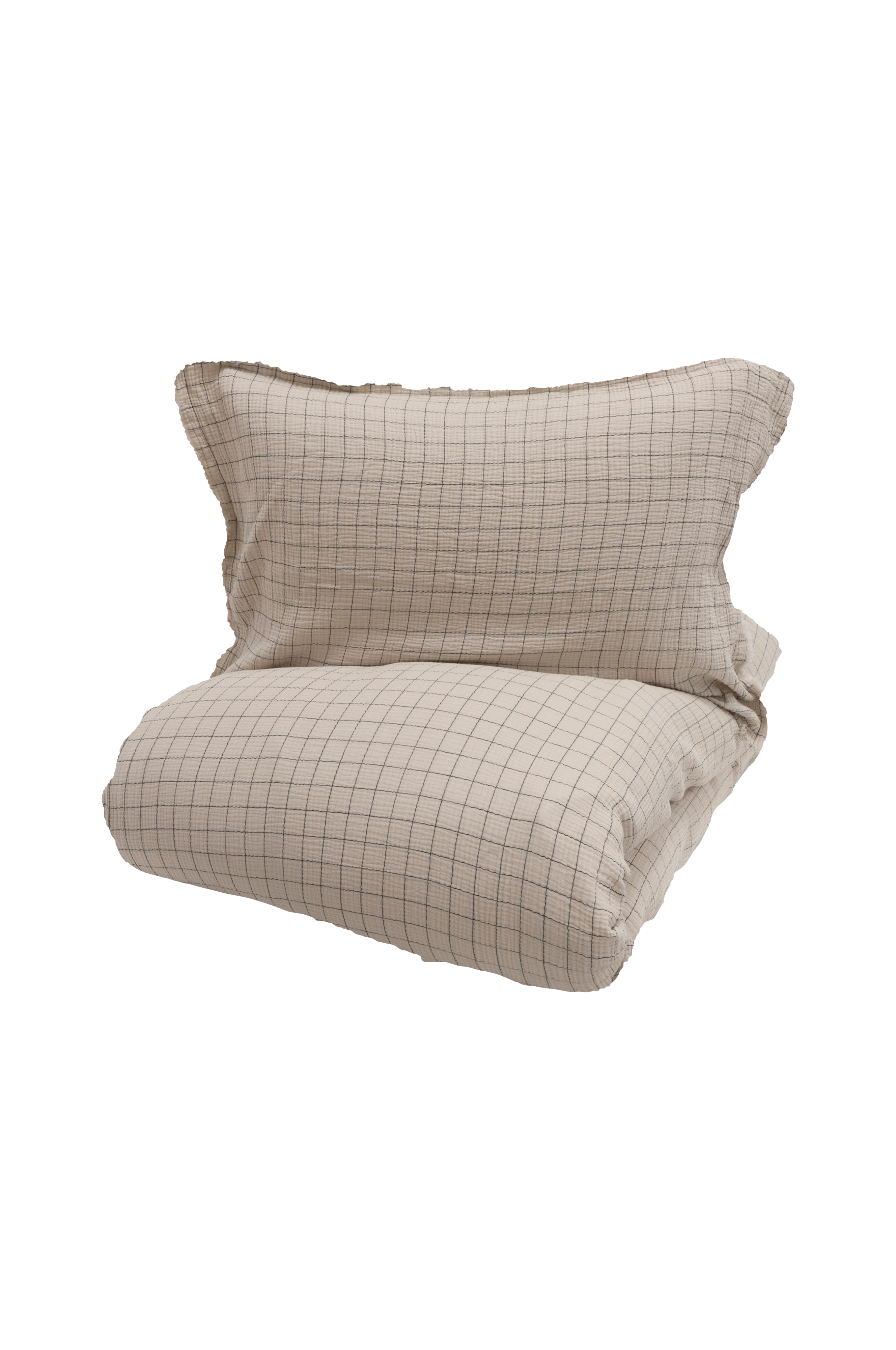 Mjukt bäddset i 100 % bomullsmuslin med rutmönster. Bomullstyget har lätt textur och ger en rynkad effekt på textilen. Detta gör tyget fantastiskt mjukt och luftigt. Både örngott och påslakan stängs med tygknappar och fransar på örngottet gör det extra tufft. Det är öpning i botten av påsklakan och sidan på örngott, med textil knappar och fransar på varje sida på örngott. Paketet består av 1 påslakan och 1 örngott tillverkad av 100 % bomullsmuslin och produktet är oeko-tex certifiserad