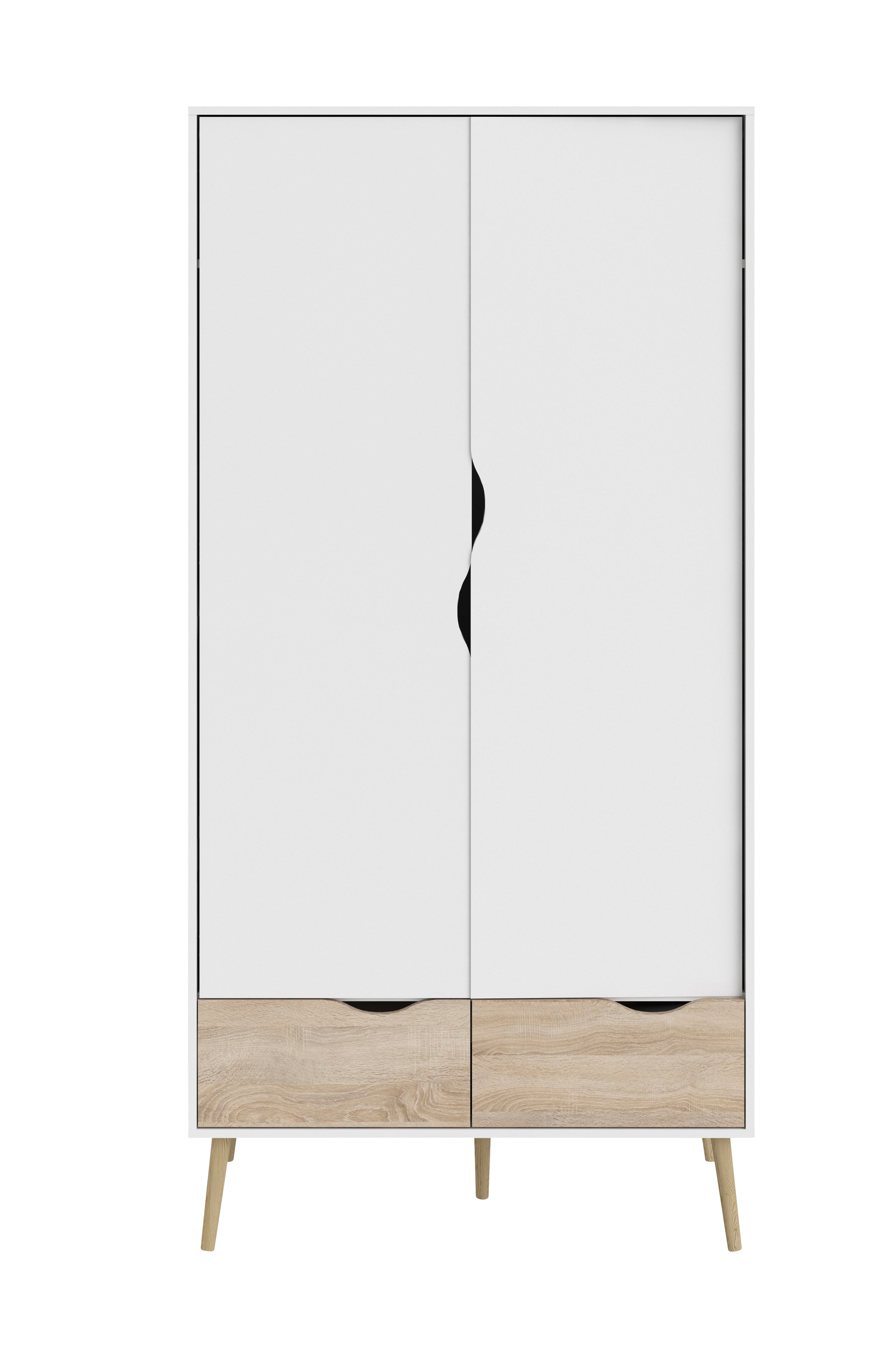 Denna moderna garderob med två dörrar och två lådor kan bli nästa fantastiska tillskott i ditt sovrum! Garderoben har runda ben som kompletterar denna nytolkning av design från 1950-talet, medan dörrarna och lådorna har utskurna handtag. Bakom de två dörrarna finns en övre hylla och en klädstång som ger gott om plats för dina kläder och andra accessoarer. Och de två lådorna längst ner passar perfekt för t-shirts, tröjor och byxor.