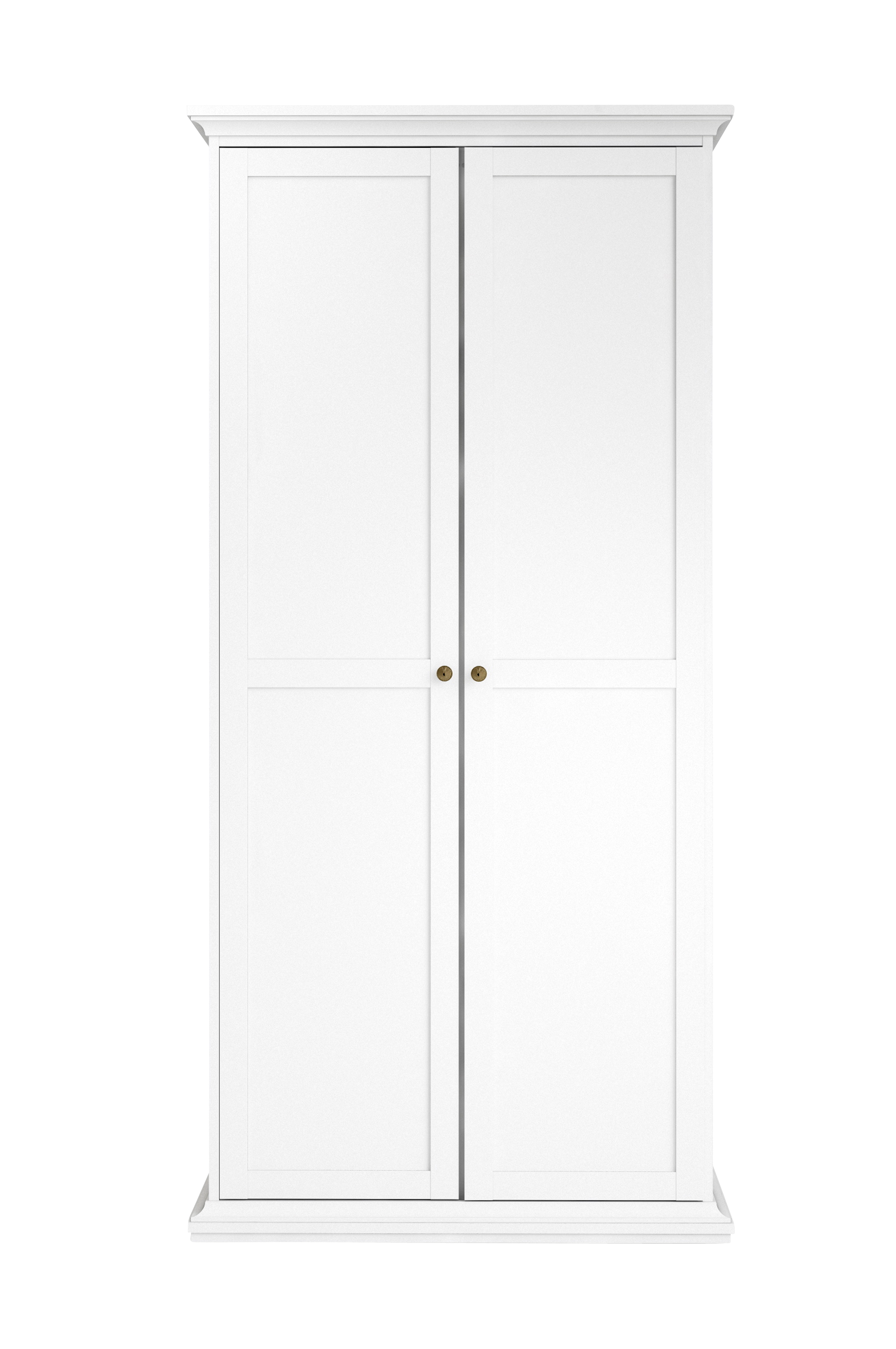 Denna klassiska garderob från Tvilum ger ditt hem en traditionell och romantisk känsla. Två rymliga skåp med gott om förvaring, som passar i sovrummet eller hallen. Tillverkad i Danmark. Garderoben har fem justerbara hyllplan och klädstång, för att enkelt organisera allt från stickade tröjor och hängande känningar till sänglinnen och annat. Den har handtag av borstad brons, sockellist upptill och nedtill och ljus yta - och charm så det förslår. Garderoben är både funktionell och dekorativ, och har en folieyta som inte bleknar och är enkel att rengöra.