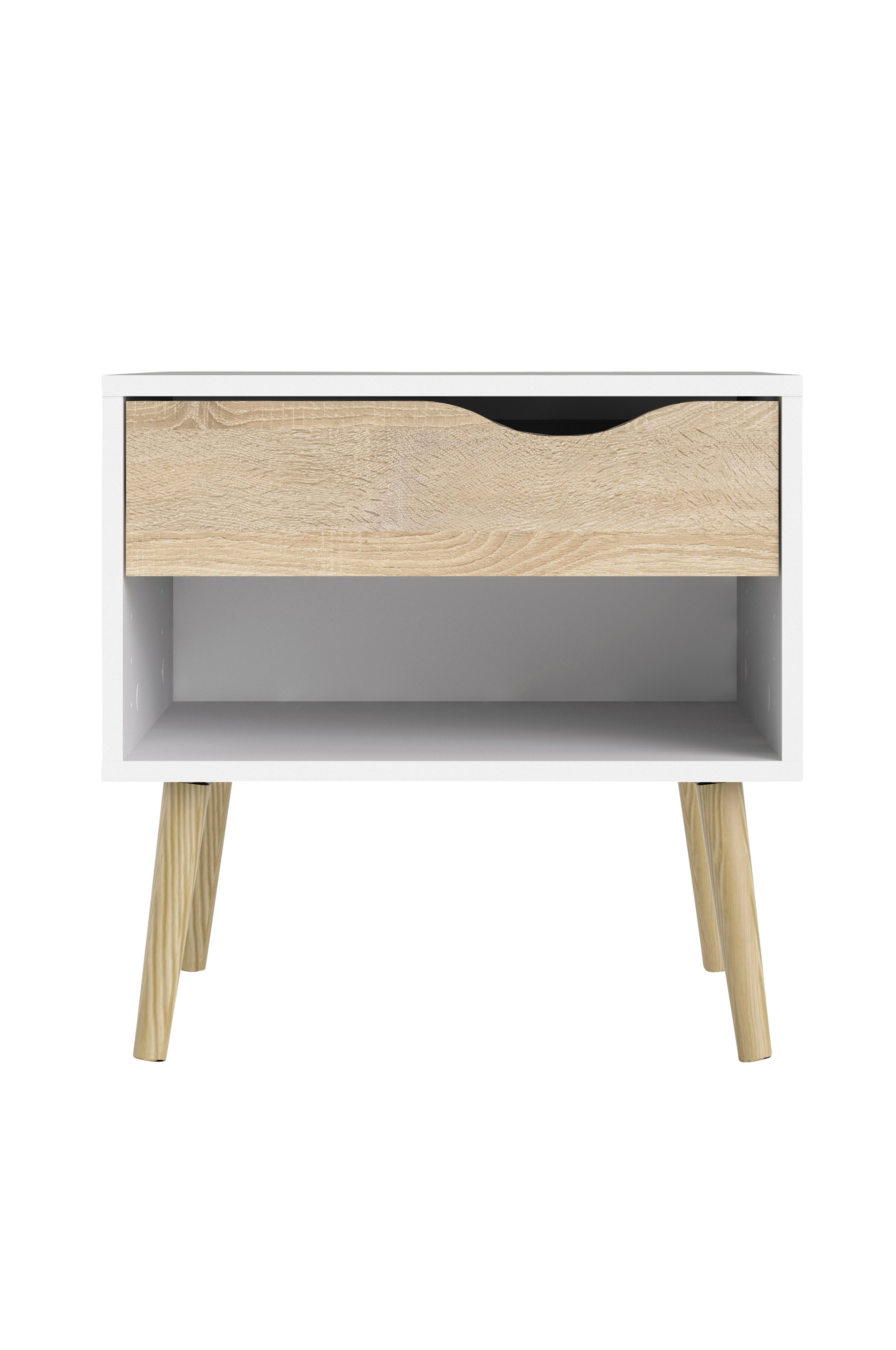 Designa ditt drömsovrum med detta moderna, retroinspirerade sängbord med en låda från Tvilum. Uppdaterad, modern design i två färger, inspirerad av 1950-talet, med lådfront med utskärning, utan handtag, och utställda ben av trä. Tillverkat i Danmark. Sängbordet har en låda och ett hyllplan, med plats för allt du behöver bredvid sängen - från böcker till laddare. Sängbord med en låda, med kvalitativa detaljer som rullskenor av metall och folieyta som är enkel att rengöra och resistent mot repor, vilket gör att det ser nytt ut längre.