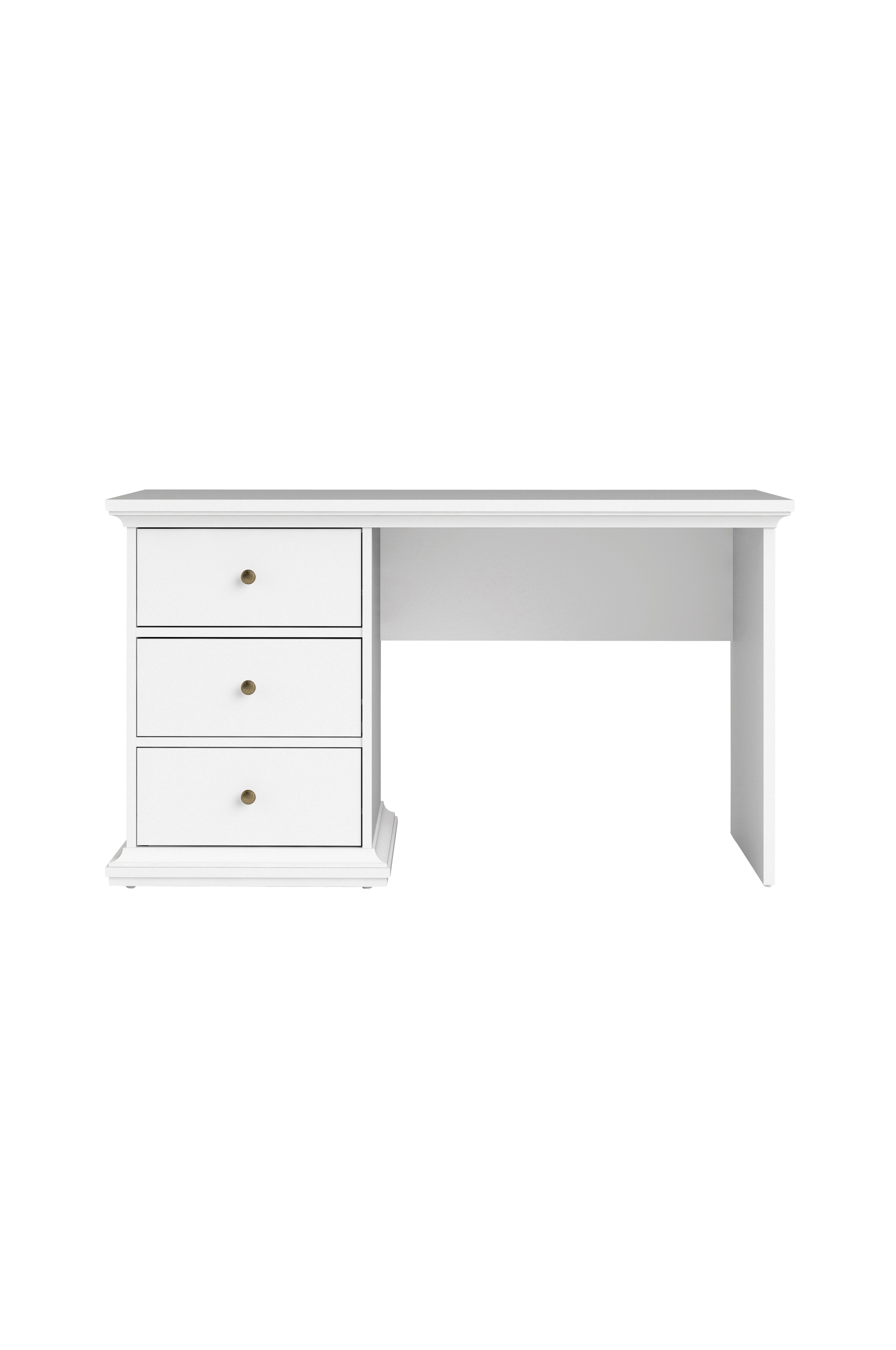Letar du efter traditionell, romantisk design? Detta klassiska skrivbord från Tvilum är perfekt för att skriva och arbeta, eller som sminkbord i sovrummet. Skrivbordet har en stor bordsyta, perfekt för din bärbara dator eller en liten bordslampa, och tre lådor hjälper dig hålla ordning på dina saker. Det har handtag av borstad brons, sockellist upptill och nedtill och ljus yta - och charm så det förslår. Skrivbordet är både funktionellt och dekorativt, och har en folieyta som inte bleknar och är enkel att rengöra. Tillverkat i Danmark.