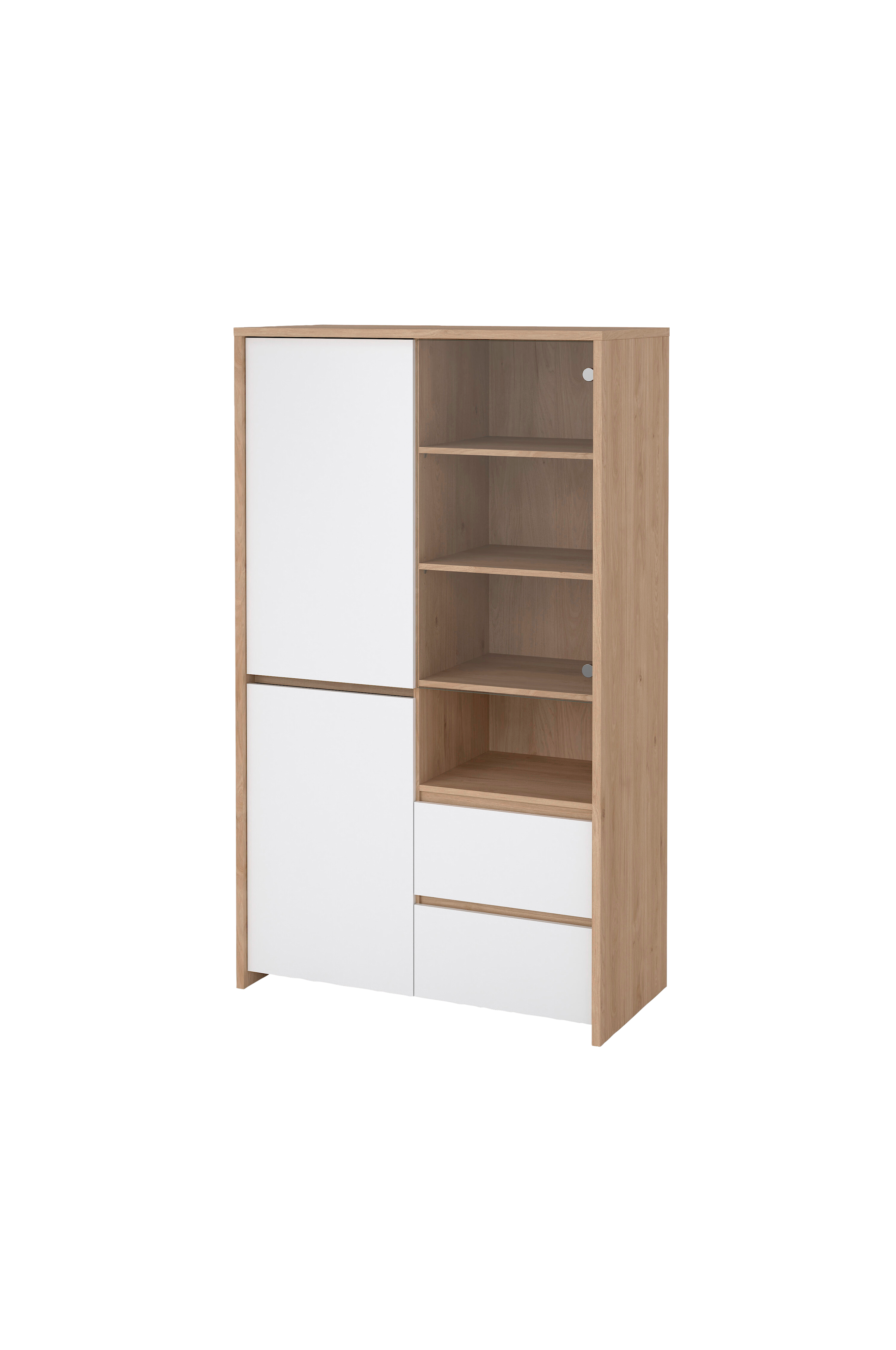 next -vitrinskåp i skandinavisk stil har en elegant design och gott om förvaringsutrymme. Det har tre stängda fack med justerbara hyllor, ett med glasdörr för utställning, ett öppet fack och två rymliga lådor. Dess 48 cm djupa konstruktion kombinerar stil och funktionalitet på ett smidigt sätt.