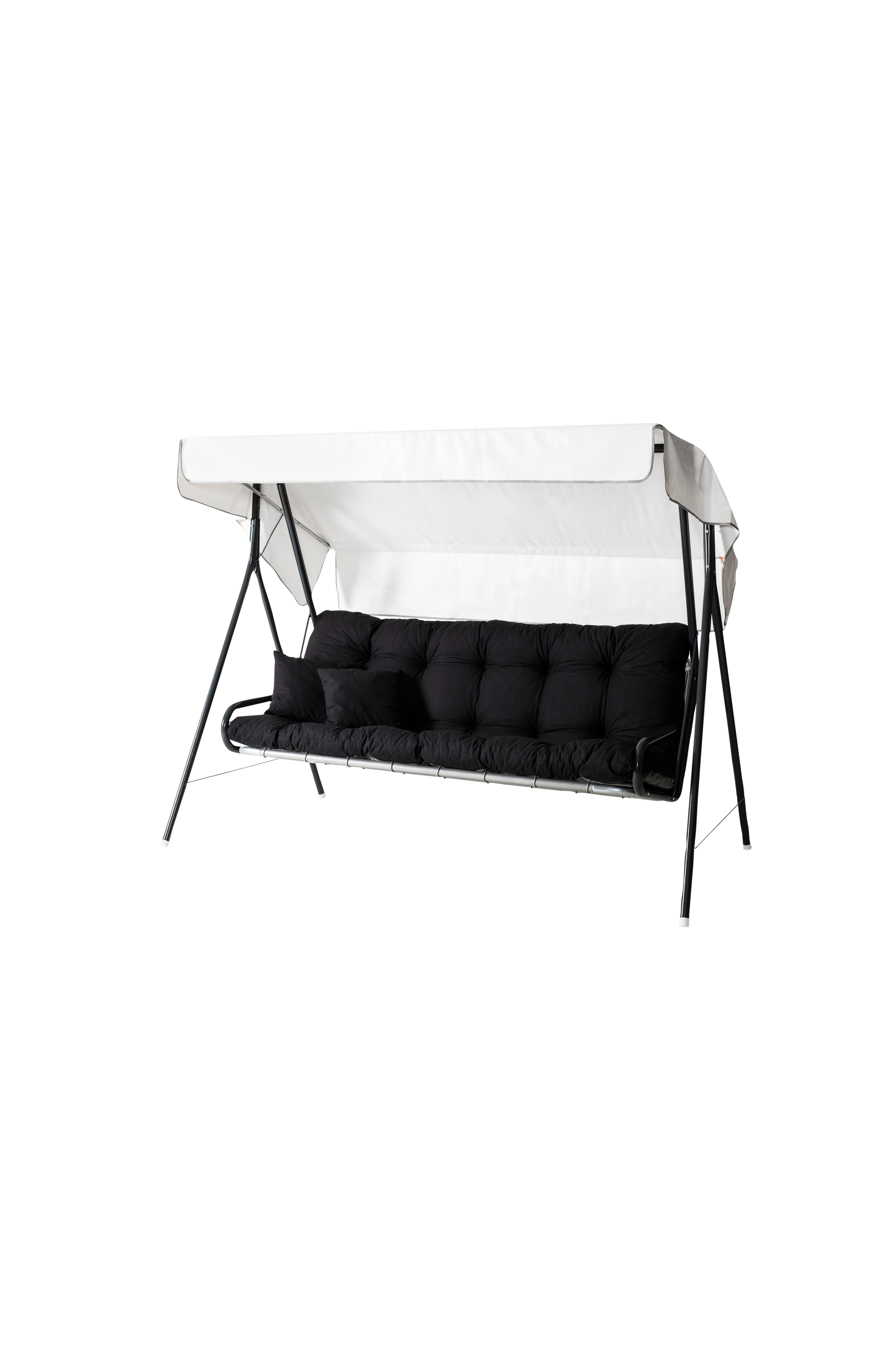 Hammock suvi 3-p med dynor. Pulvermålad stålrörsstomme som är förbehandlad med bonderite®. Förzinkat metallnät i rygg- och sittdelen. Högt ryggstöd som gör det bekvämt att sitta och i paketet ingår även två armstödsdynor samt ett tak. Storleken på sittdynan 160 x 50 cm och ryggstödsdynan 160 x 70 cm. Dynorna är fyllda med strimlat skum och tyget består av 50% bomull och 50% polyester. Dynornas tyg uppfyller klassificeringen oeko-tex®standard 100, så det finns inga spår av allergiframkallande, irriterande eller giftiga ämnen. Dynorna kan rengöras genom att torka av med en fuktig trasa och vid behov kan man använda ett milt rengöringsmedel. Vid regn och oväder rekommenderar vi att förvara dynorna inomhus och att taket plockas ned. Produkten är tillverkad i finland.
