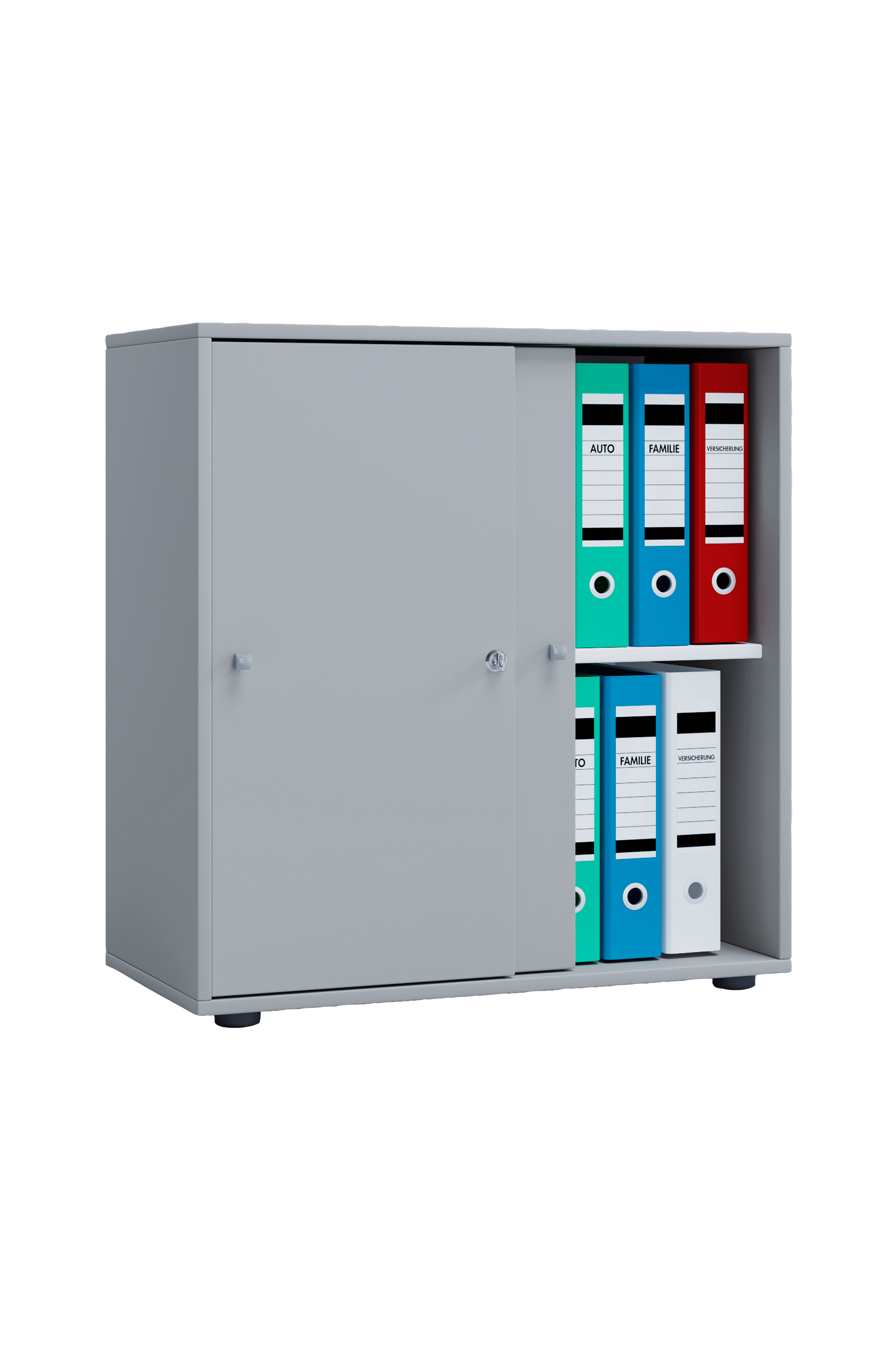 vcm kontorsskåp "lona l" har två skjutdörrar, ett variabelt hyllplan och tillräckligt med utrymme för 14 mappar och andra redskap. Korpusen är tillverkad av en trästrukturreproduktion och har en stabil bakre bräda.