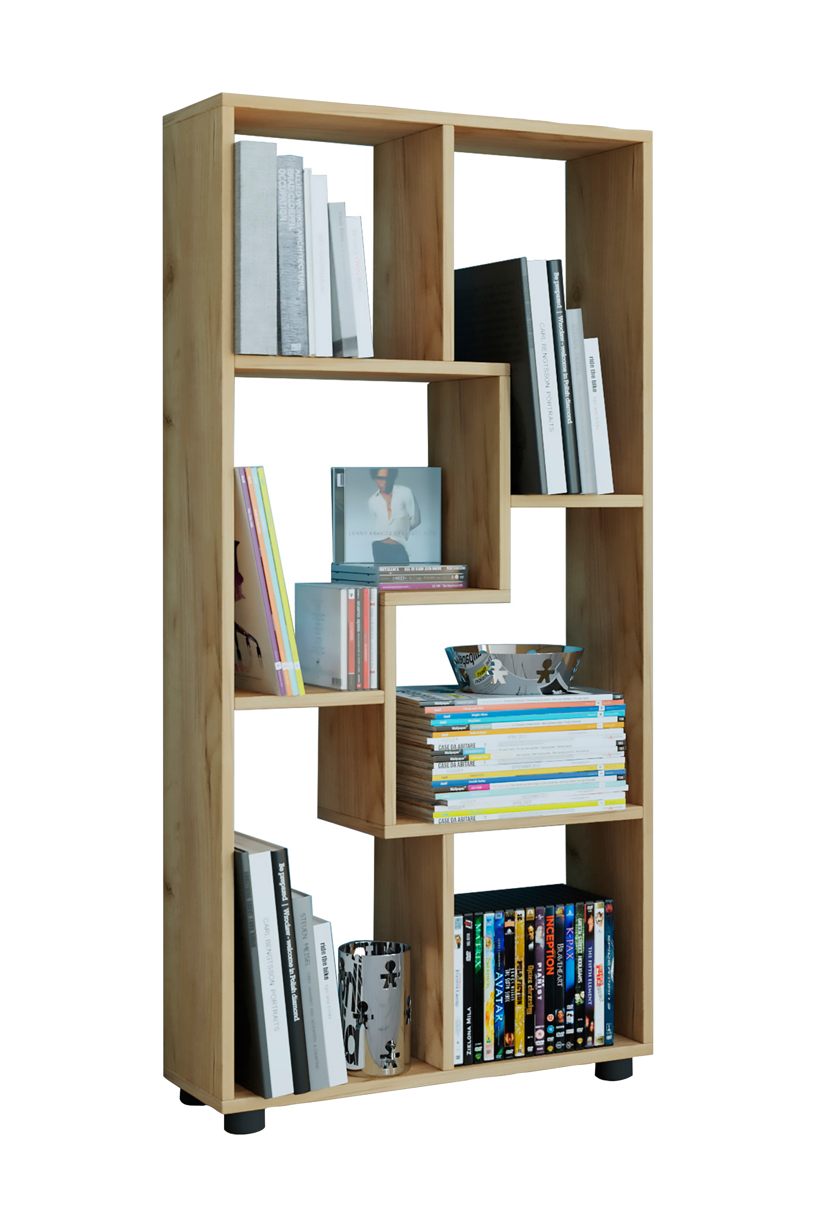 Denna möbel är tillverkad av trästrukturreplika. Hyllan är flexibel i användning och kan användas som rumsavdelare i alla vardagsrum.