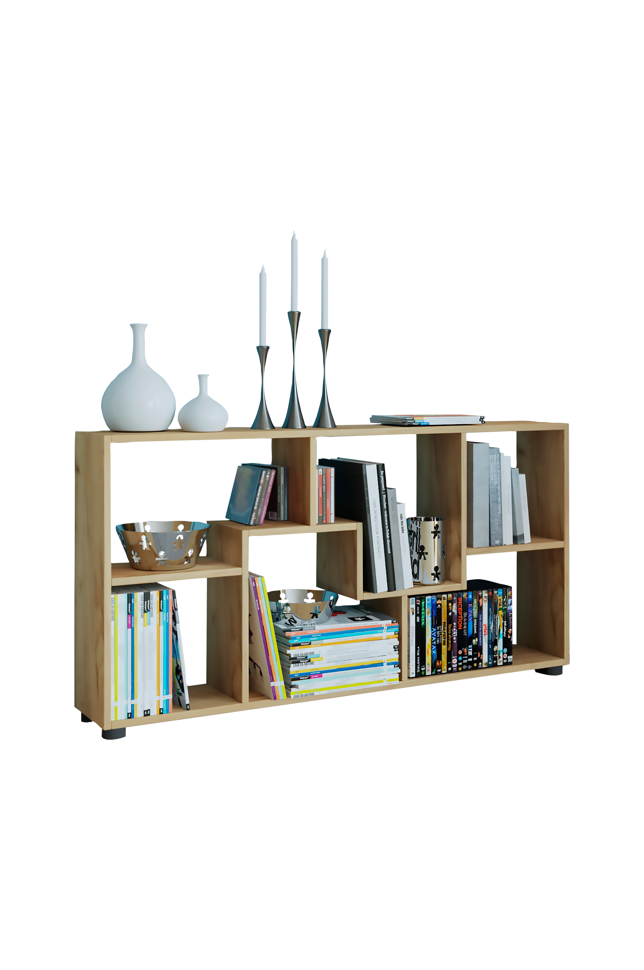Denna möbel är tillverkad av trästrukturreplika. Hyllan är flexibel i användning och kan användas som rumsavdelare i alla vardagsrum.