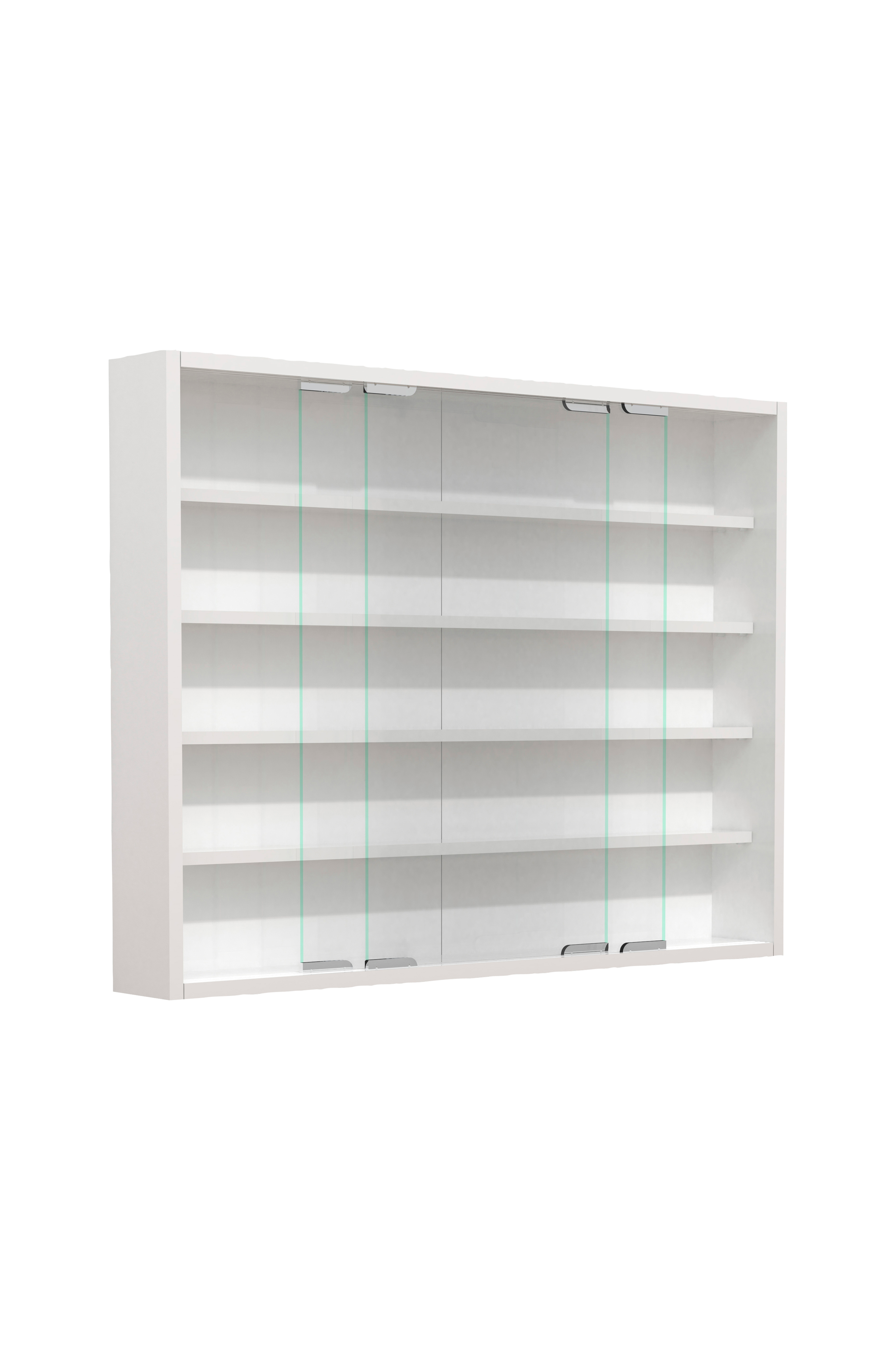 vitrinskåpet har två skjutbara glasdörrar och bakom dem finns fyra hyllplan för fem fack.