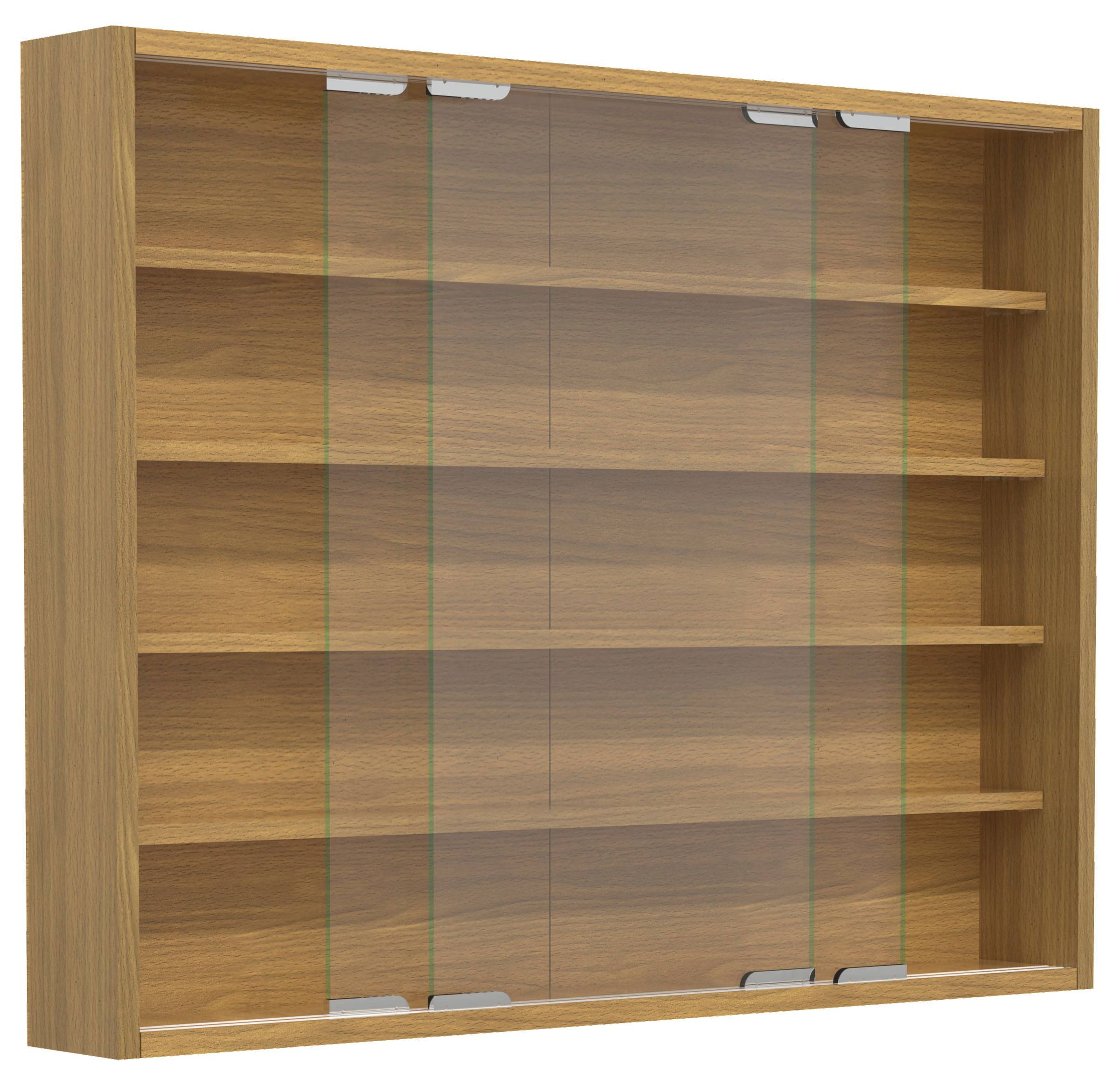 vitrinskåpet har två skjutbara glasdörrar och bakom dem finns fyra hyllplan för fem fack.