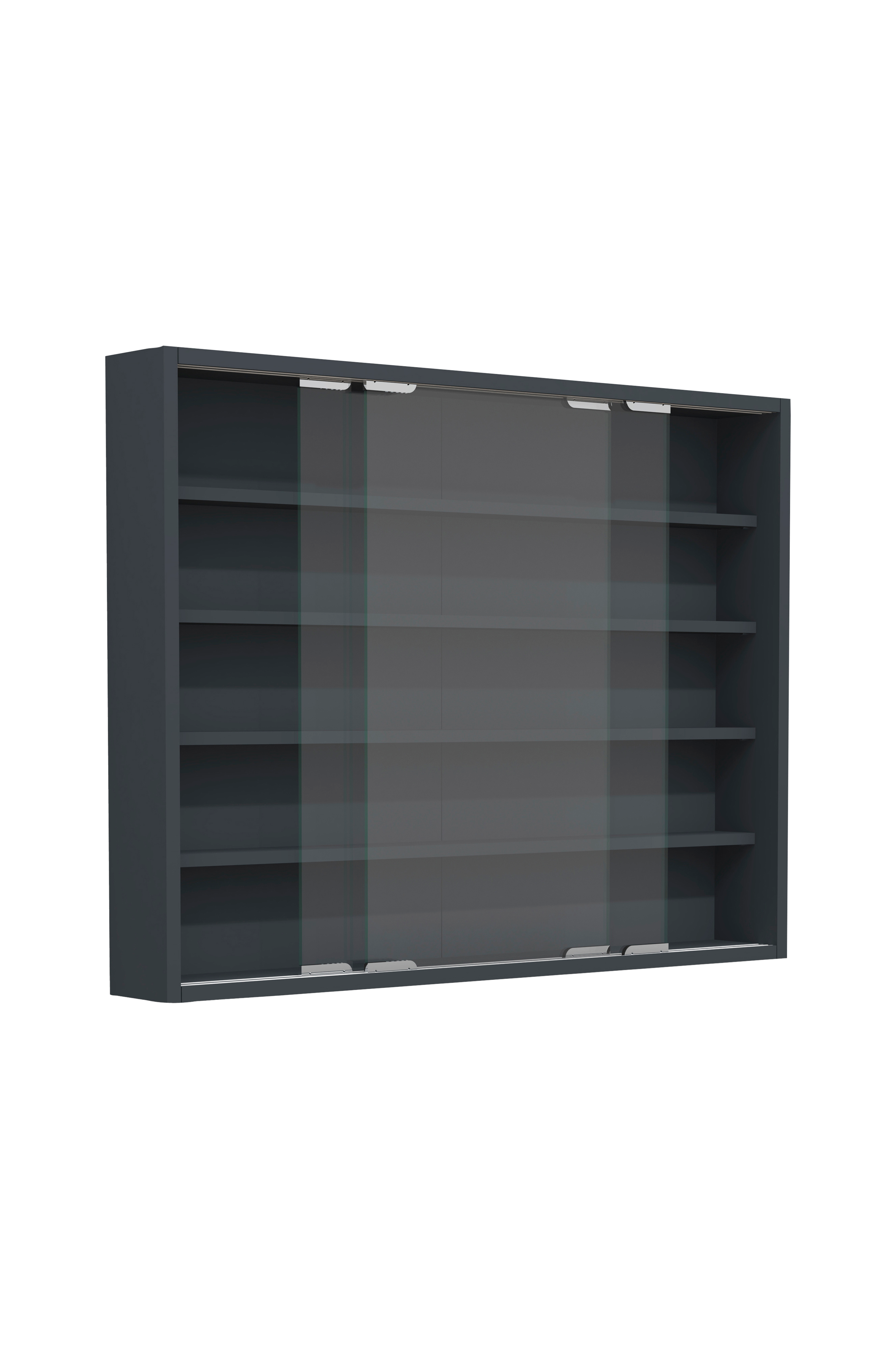 vitrinskåpet har två skjutbara glasdörrar och bakom dem finns fyra hyllplan för fem fack.