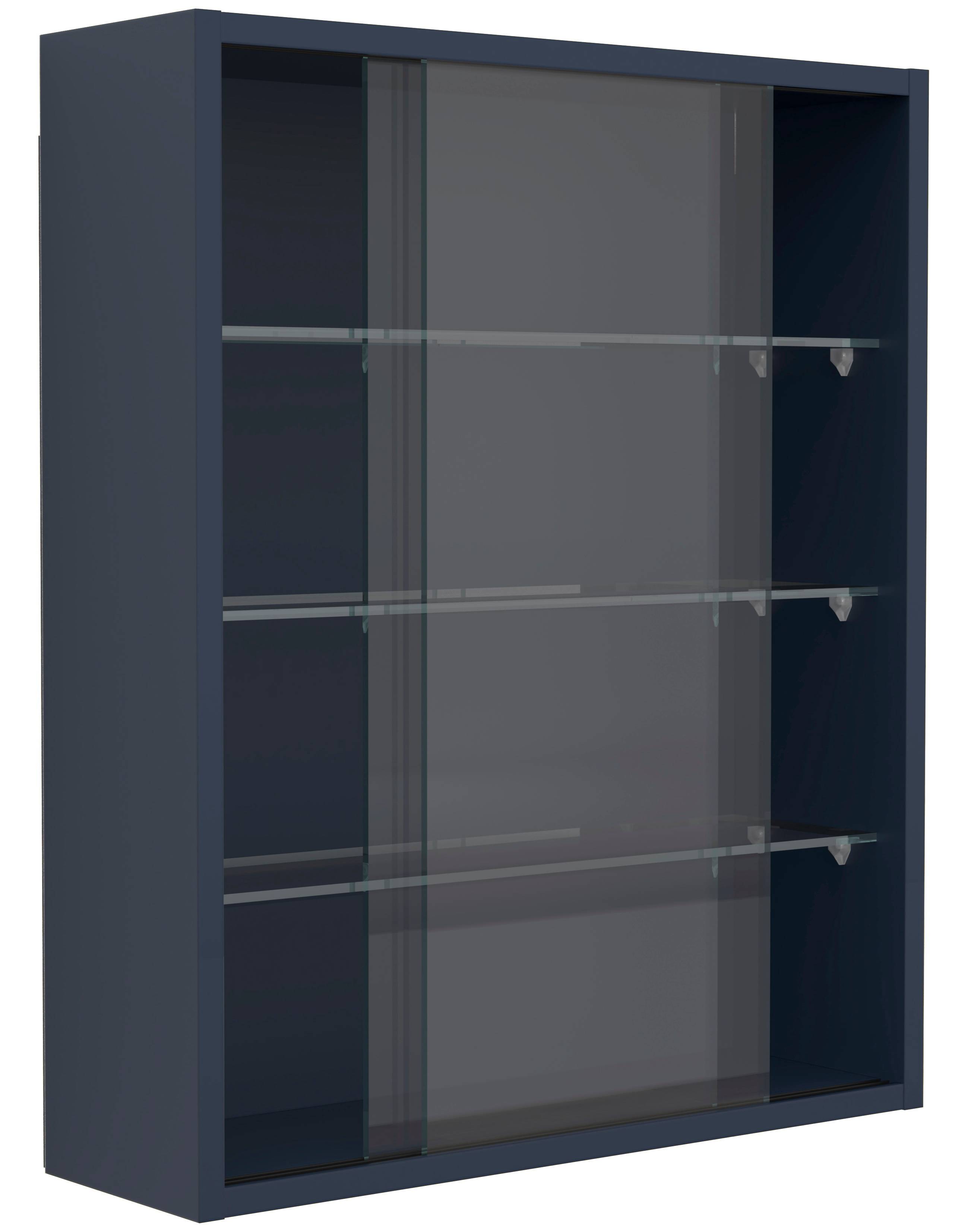 Tre glashyllor skapar fyra fack som ger gott om överskådligt förvaringsutrymme. Två skjutbara glasdörrar håller dammet borta från interiören så att dekorationer och föremål kan visas upp på ett vackert sätt.