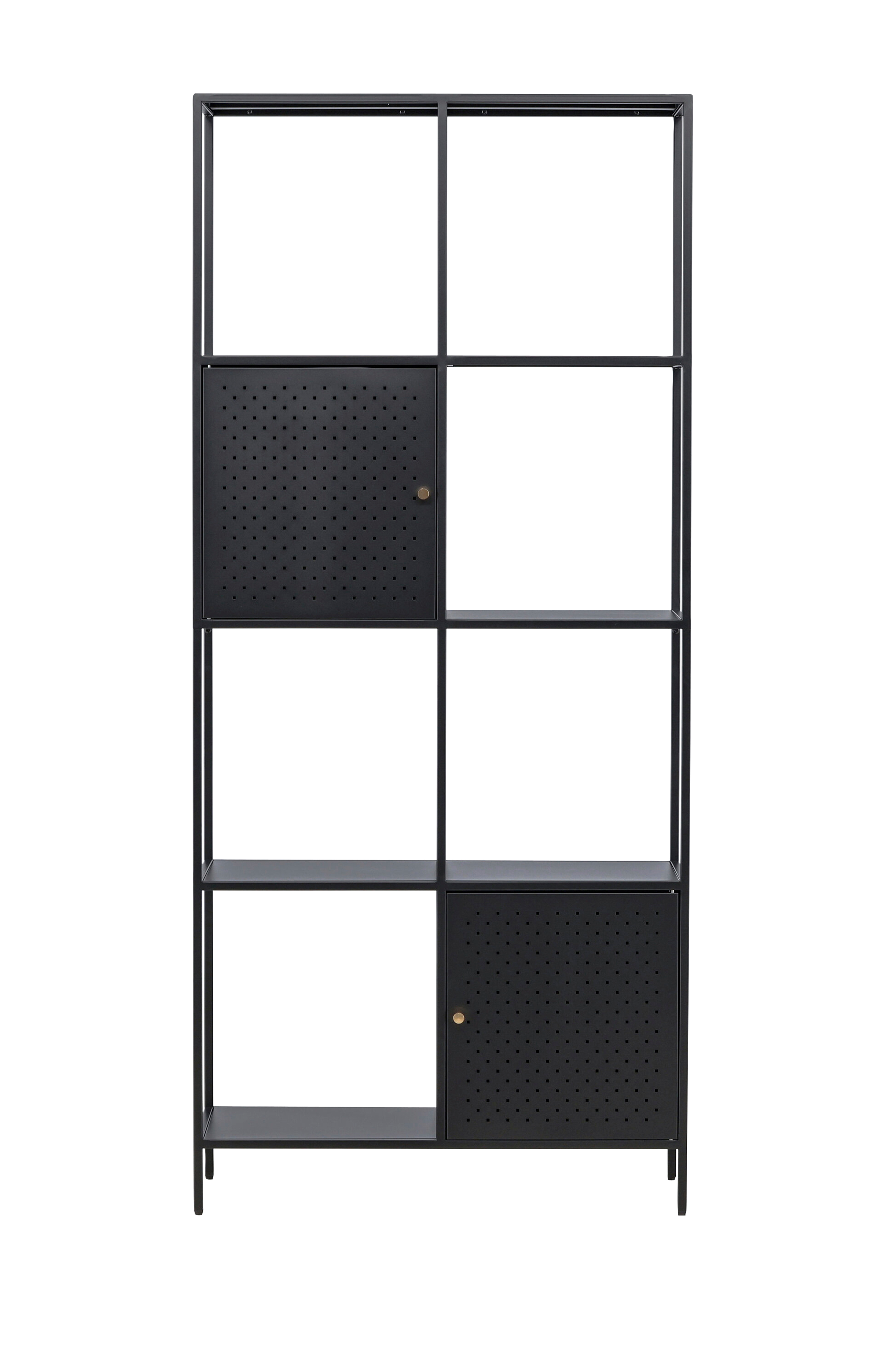 Med sin höga och smala design erbjuder den här hyllan en unik kombination av öppen och dold förvaring på sina fyra rymliga hyllplan. Två skåp placerade på olika höjder med eleganta mässingsfärgade knoppar ger en perfekt plats att gömma undan små föremål och skapa en organiserad yta. De öppna hyllorna är utformade för att visa upp dina vackra dekorationer eller ljusstakar, vilket ger en känsla av mysighet.