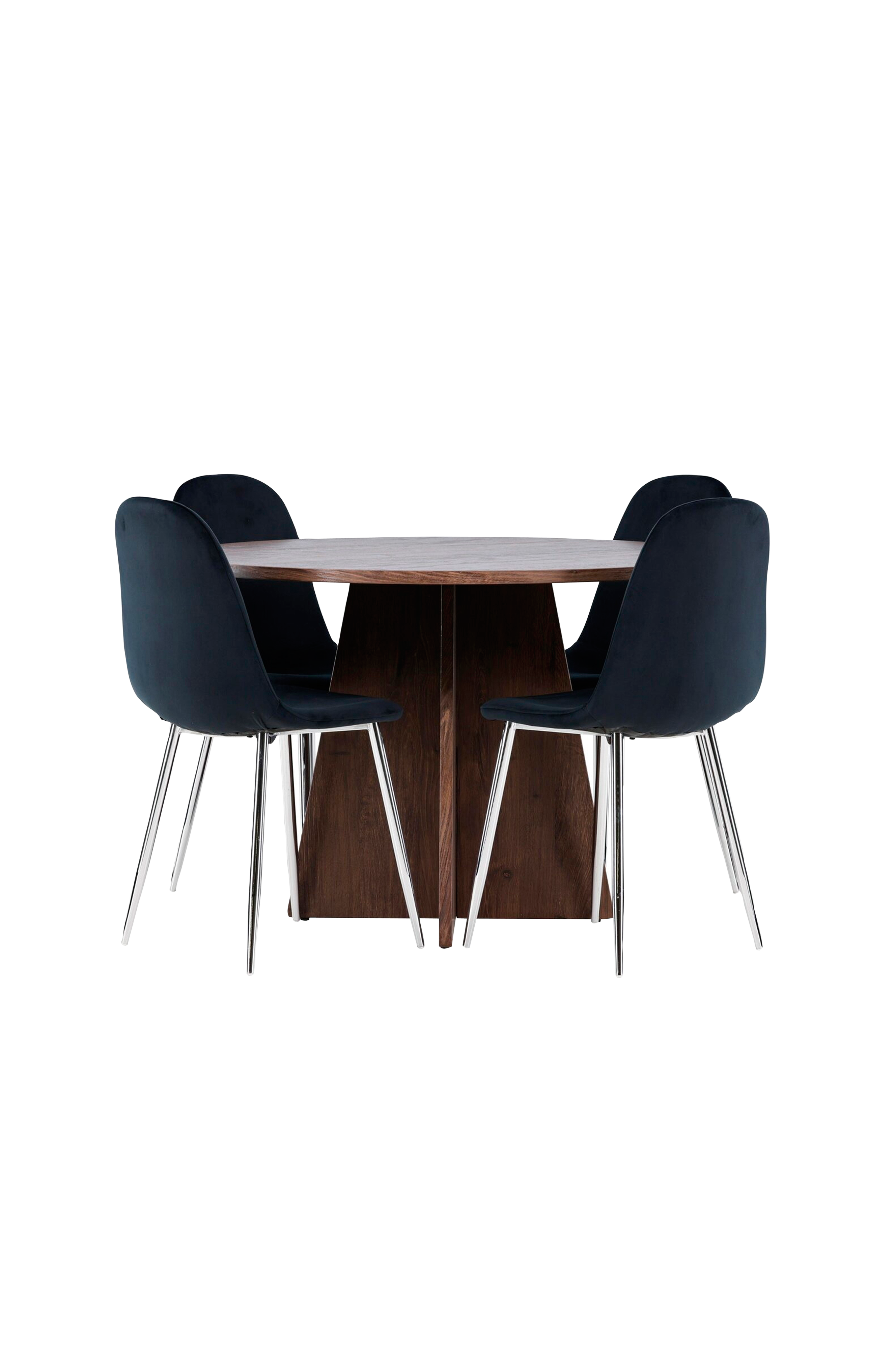 Skapa en inbjudande och elegant matplats med vår eleganta matgrupp som kombinerar det sofistikerade bootcut-bordet med de lyxiga polarstolarna. Denna matgrupp är perfekt för både vardagsmiddagar och festliga tillfällen och ger din matsal en modern och raffinerad atmosfär. Bootcut-bordet, tillverkat av mdf, ger en varm och inbjudande känsla. Med en diameter på 110 cm erbjuder det gott om utrymme för mat och samtal, medan dess runda form skapar en harmonisk och balanserad miljö i din matsal. Den solida konstruktionen garanterar långvarig användning och stabilitet. De fyra polarstolarna kompletterar bordet perfekt med sina eleganta sitsar i mjuk sammet. Dessa stolar erbjuder både komfort och stil, vilket gör dem idealiska för långa, trevliga middagar med familj och vänner. Deras moderna design med höga ryggstöd och lyxiga sitsar ger en sofistikerad touch till din matsal och skapar en känsla av lyx. Denna matgrupp är en perfekt kombination av estetik och funktionalitet, vilket gör den till ett utmärkt val för dig som vill ha en elegant och bekväm matplats. Uppgradera din matsal med den vackra kombinationen av bootcut-bordet och polarstolarna, och skapa en plats där minnen och glädje delas.