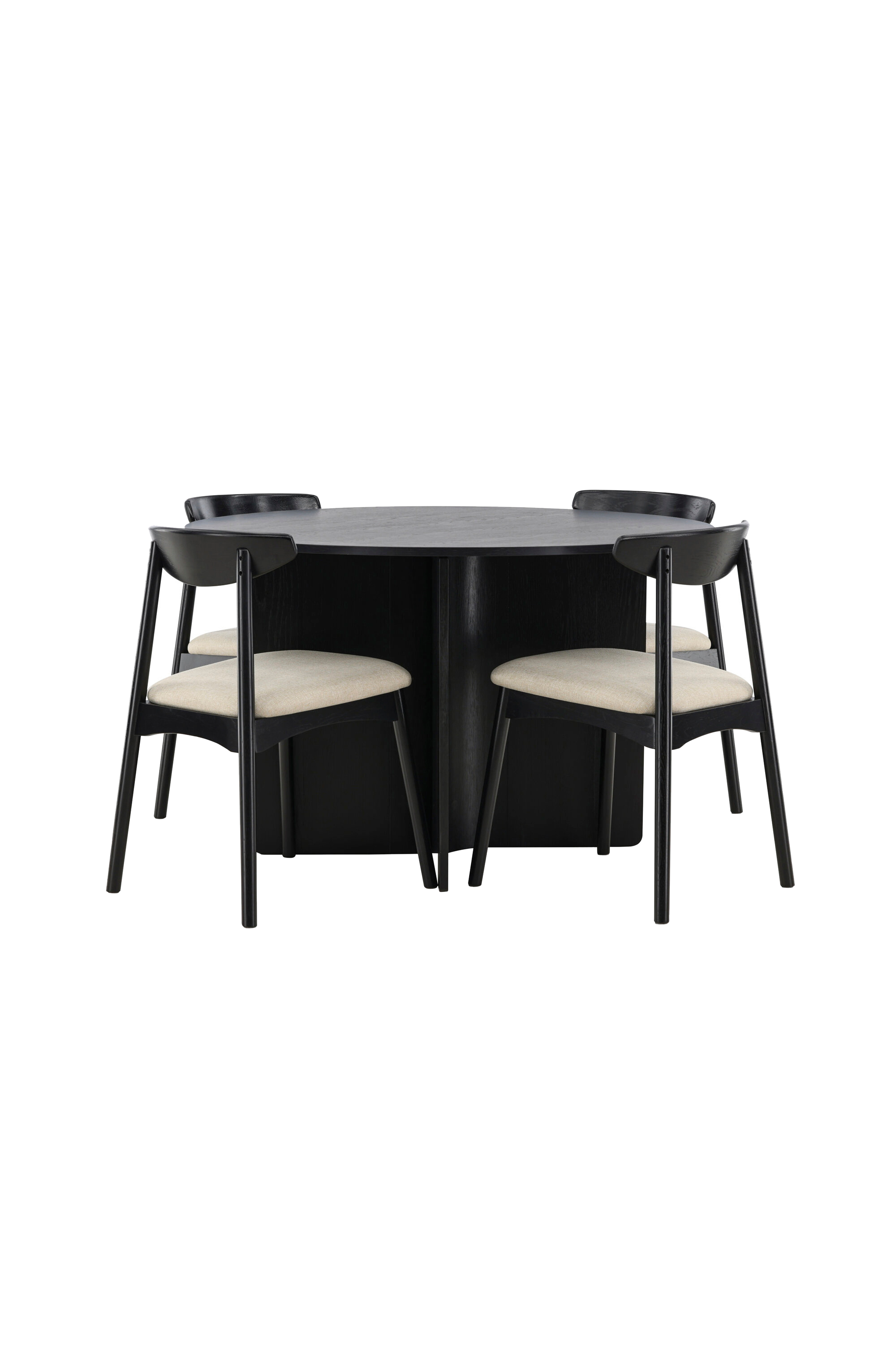 Runt bordet står de eleganta ven stolarna, vars svarta stativ matchar bordet, medan de beigea dynorna ger en varm och mjuk kontrast. Tillsammans skapar de en balanserad komposition där färg och form harmonierar på ett vackert sätt.