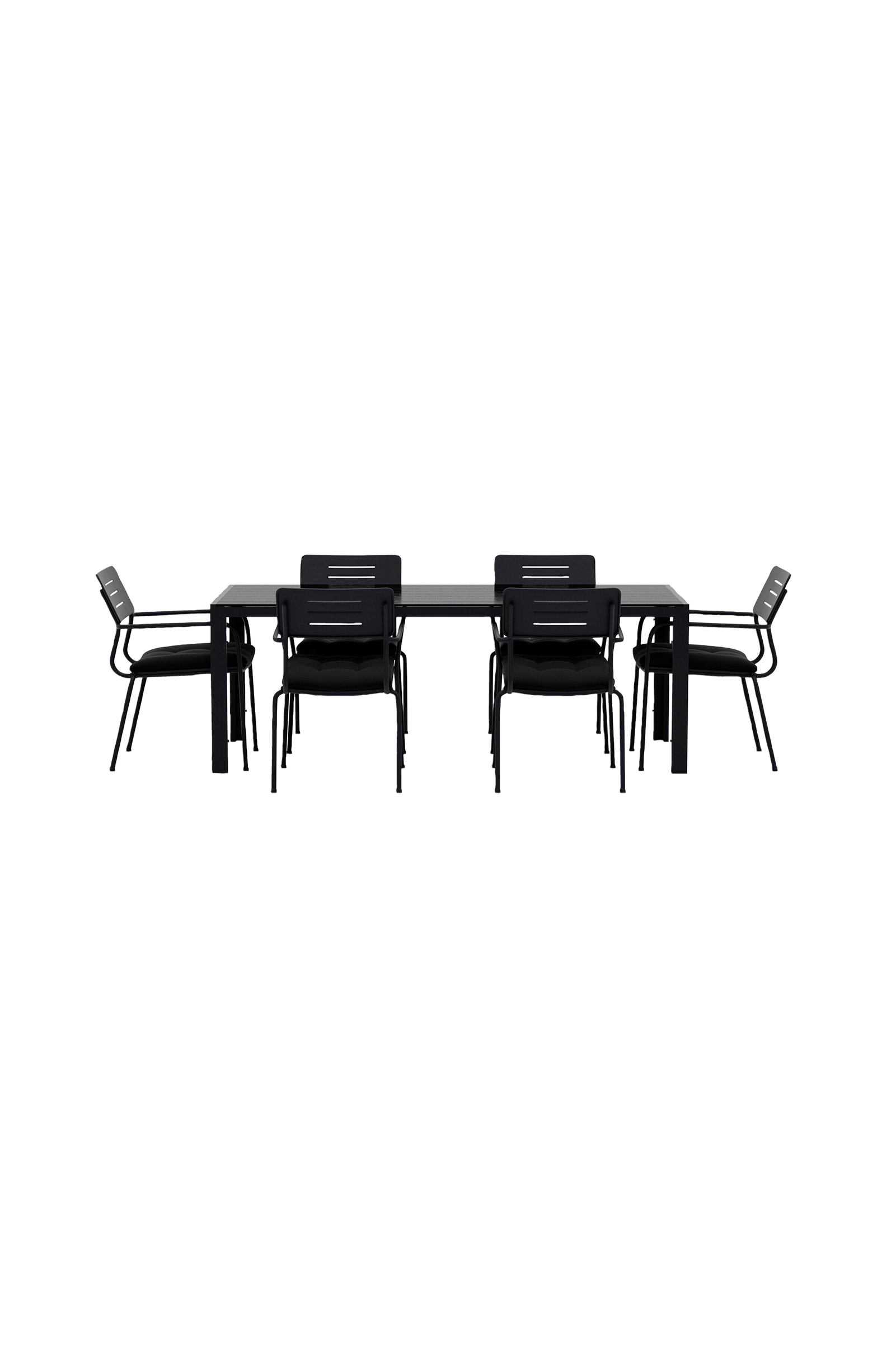 Ge din uteplats en elegant och funktionell uppgradering med denna moderna matgrupp som kombinerar det rektangulära breakbordet med sex nicke-stolar - en perfekt lösning för både vardagens måltider och sommarens härliga utomhusstunder.