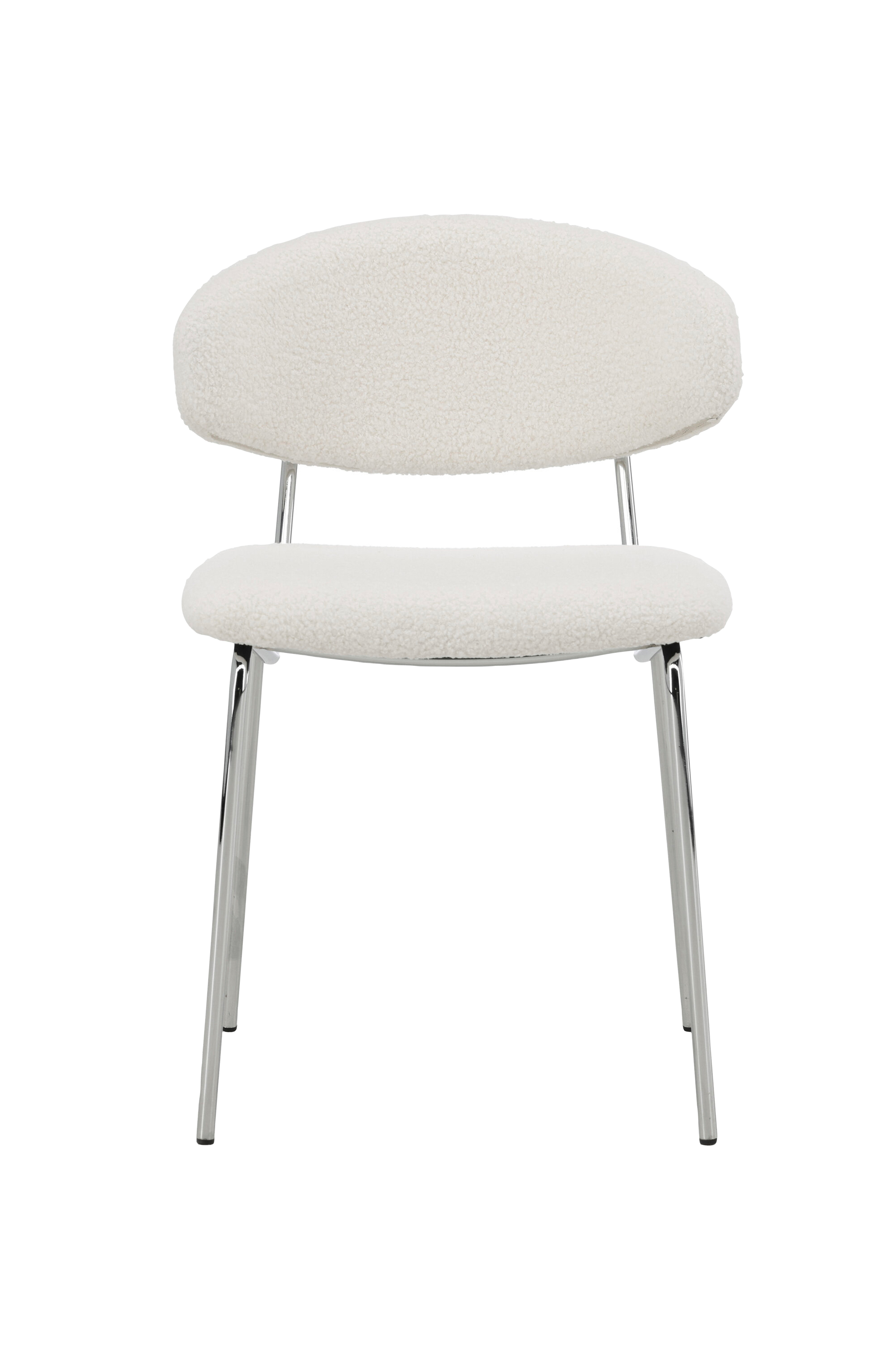 Chico är en modern matstol som kombinerar stilren design med hög komfort. Sitsen och ryggstödet är klädda i ett vitt bouclé-tyg som ger en mjuk och inbjudande känsla, samtidigt som det ger textur och karaktär till rummet. Benen i kromat stål ger en elegant kontrast och bidrar till en lätt och luftig silhuett.