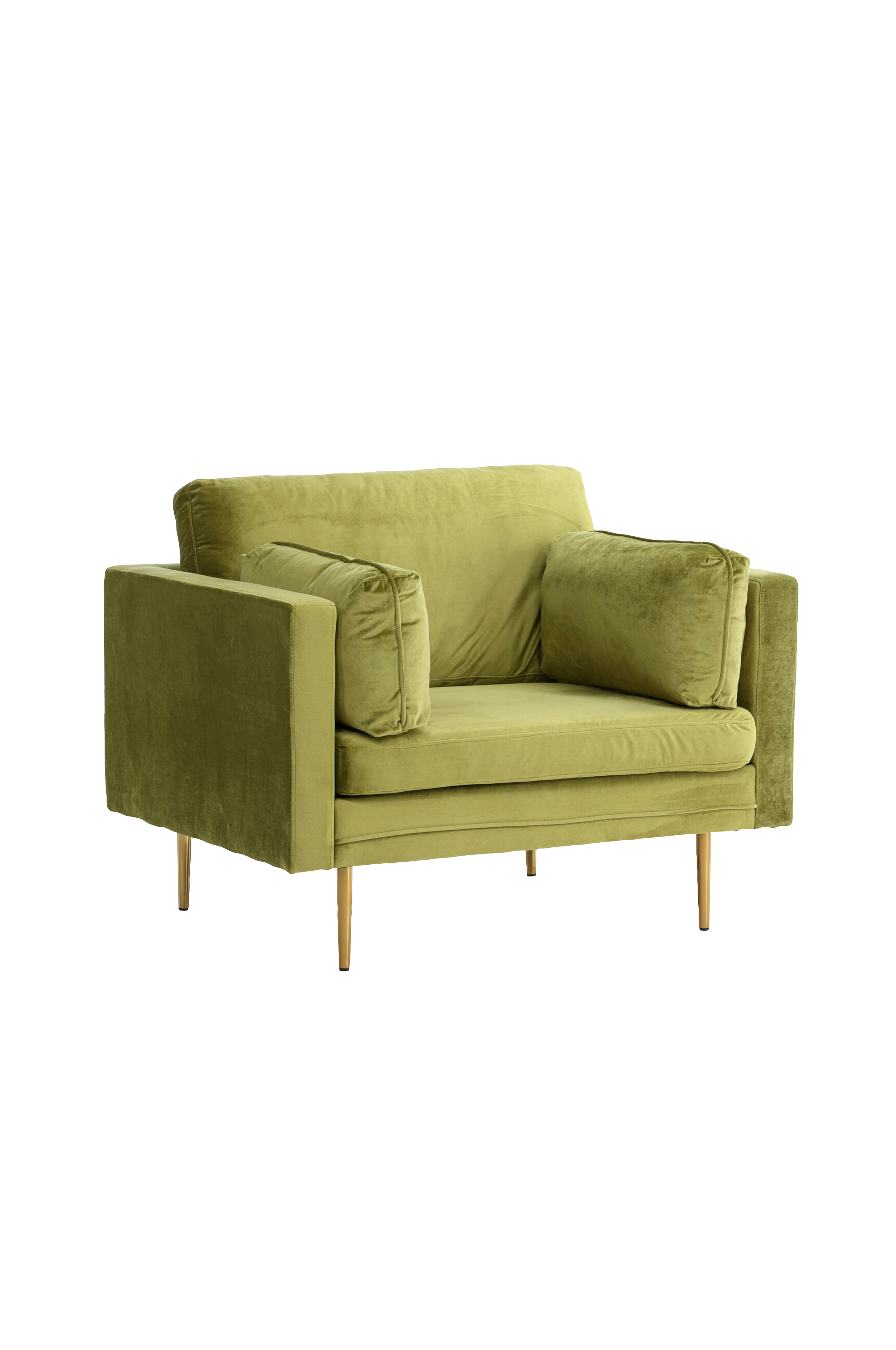 Bekväm fåtölj i sammet med mässingfärgade metallben. Trästomme och sits med nozagfjädrar och polyeter. Martindale >10.000. Sittbredd 88 cm. Höjd till armstöd 70 cm. Höjd på ben 20,5 cm. Tjocklek på sittdynor 15 cm och ryggdynor 20,5 cm. Montera endast benen.