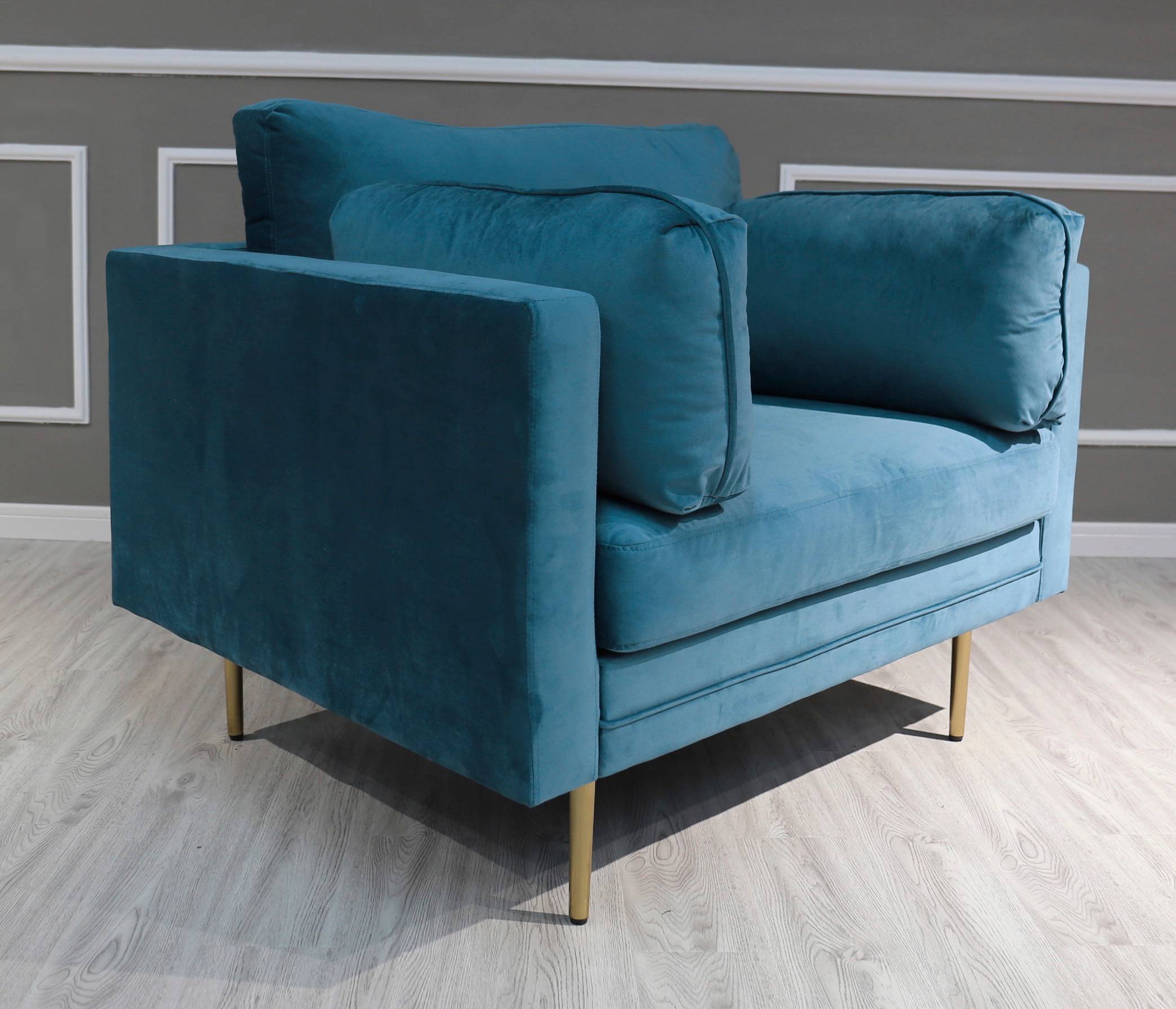 Bekväm fåtölj i sammet med mässingfärgade metallben. Trästomme och sits med nozagfjädrar och polyeter. Martindale >10.000. Sittbredd 88 cm. Höjd till armstöd 70 cm. Höjd på ben 20,5 cm. Tjocklek på sittdynor 15 cm och ryggdynor 20,5 cm. Montera endast benen.