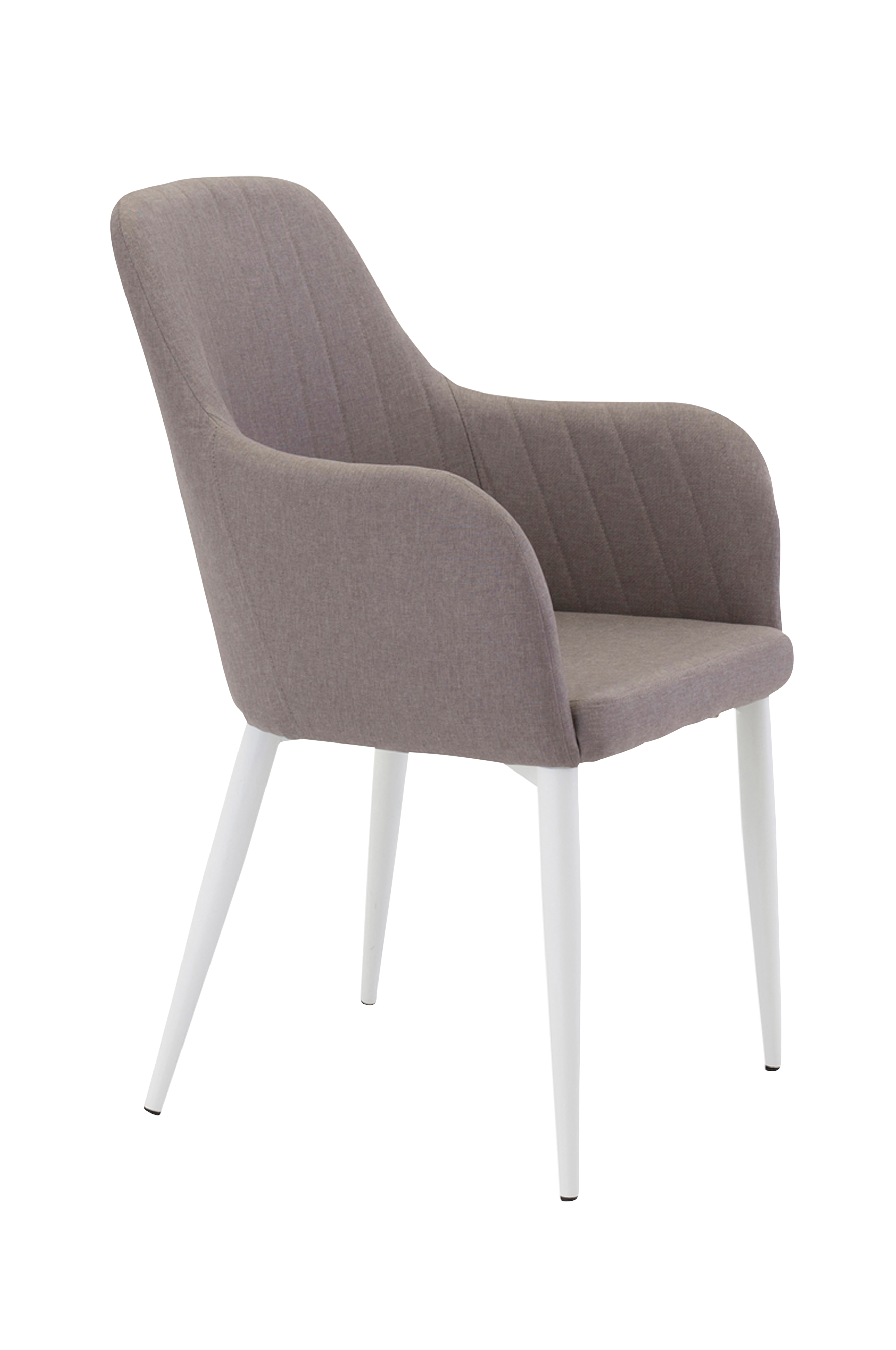 Charmfull karmstol i rundade snitt med mellantt tyg på sits och rygg samt stolsben. Fungerar perfekt som matstol.
