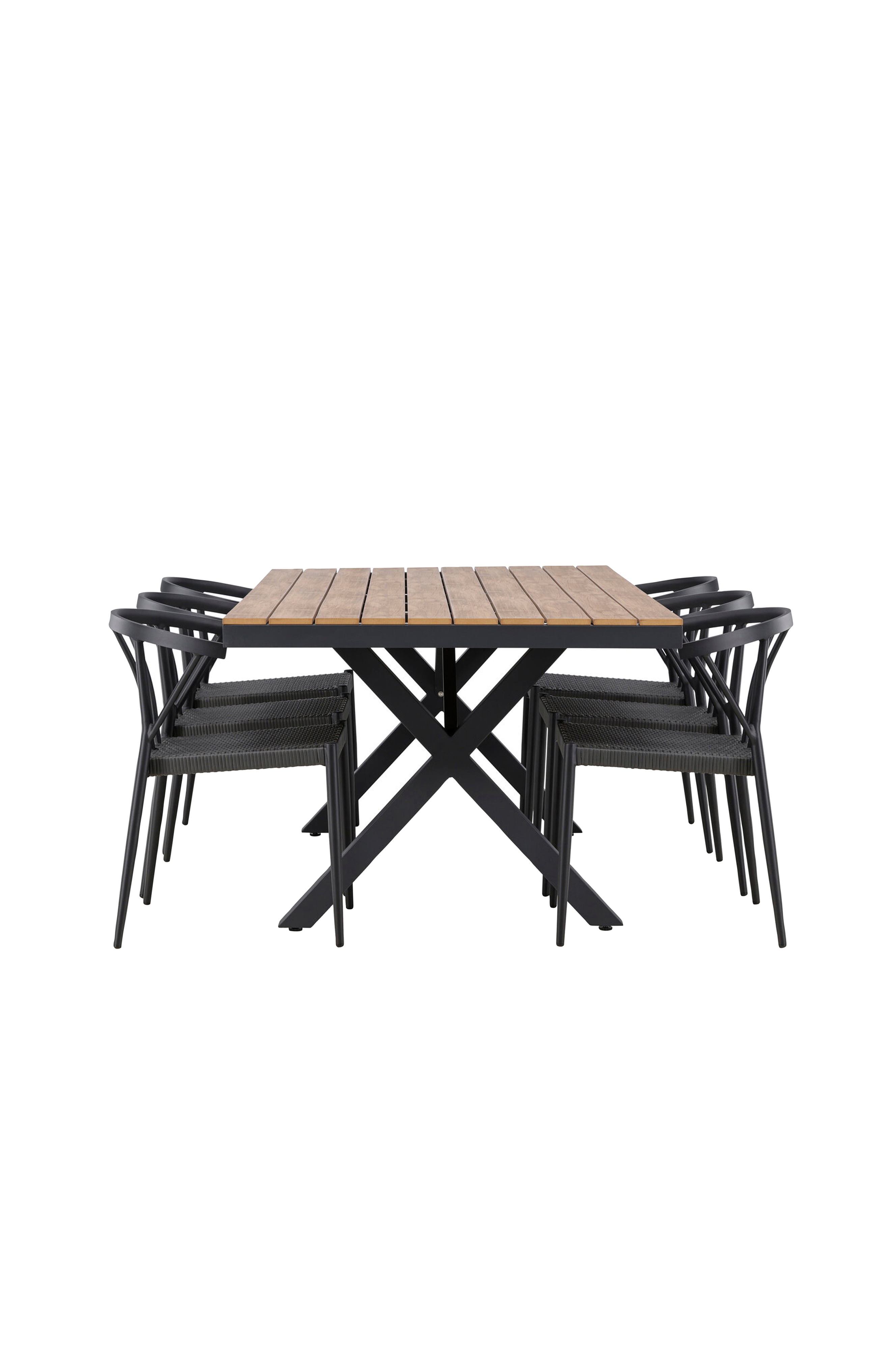 bordet, garcia, är en imponerande skapelse som mäter 100x200 cm. Bordet är tillverkat av aluminium och ger en stabil och pålitlig yta för dina måltider utomhus. Den varma färgen ger en jordnära känsla som smälter in sömlöst i omgivningen samtidigt som den tillför en touch av elegans till ditt utomhusutrymme. Stolarna, med namnet stina, är ett perfekt komplement till bordet garcia. Stolarna är tillverkade av slitstarkt rottingmaterial i en sofistikerad svart nyans och erbjuder både komfort och stil. Med sex stolar i setet kan du enkelt välkomna familj och vänner till trevliga middagar och sammankomster utomhus.