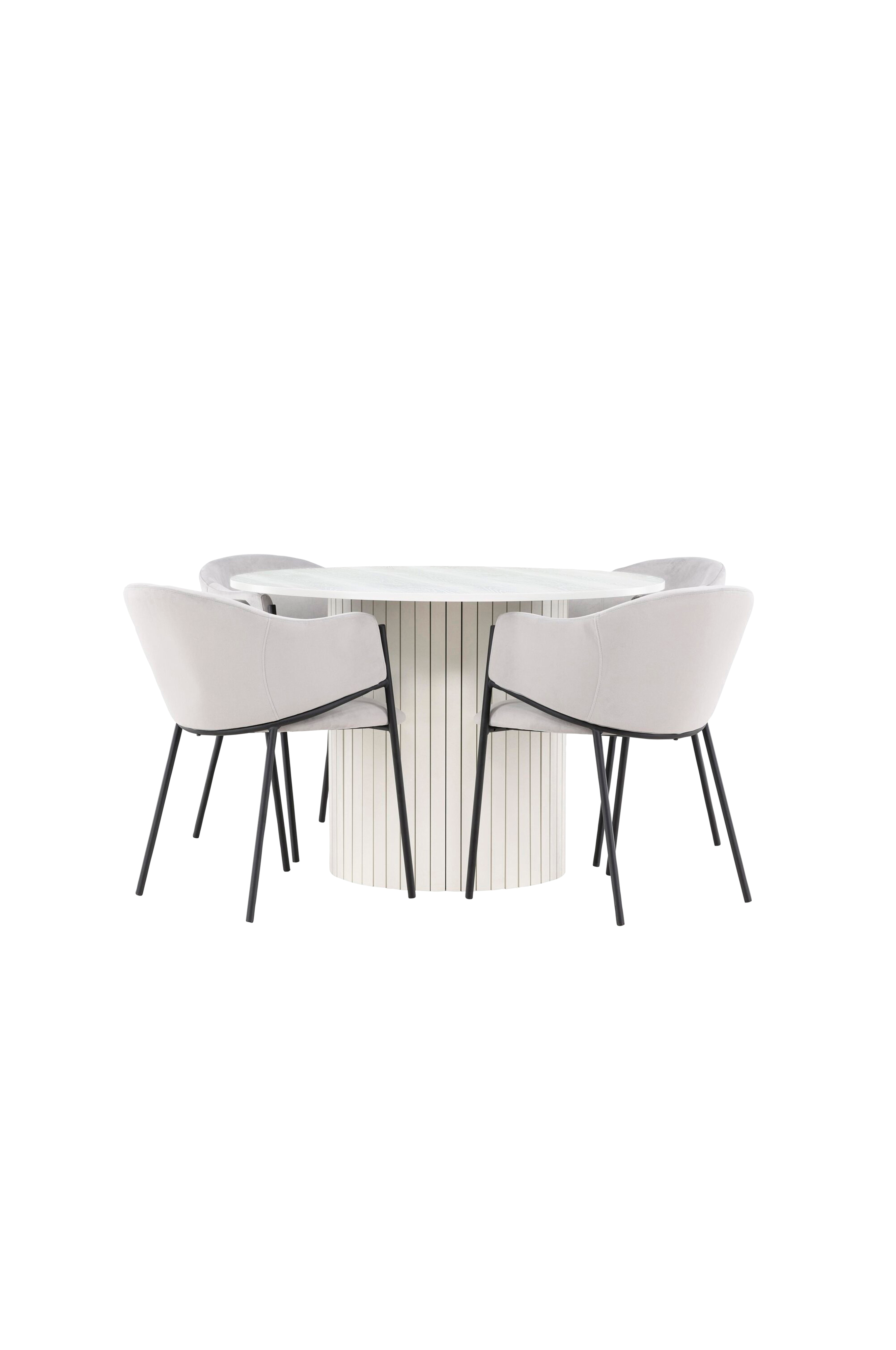 Skapa en elegant och inbjudande matplats med vår eleganta matgrupp som kombinerar det moderna bordet Häron med de bekväma stolarna Evelina. Denna matgrupp är perfekt för både vardagsmiddagar och festliga tillfällen och ger din matsal en sofistikerad och modern känsla. Häron-bordet, som är tillverkat av mdf, har en finish som ger en ljus och fräsch atmosfär till din matsal. Med en diameter på 110 cm erbjuder bordet gott om utrymme för mat och samtal, samtidigt som dess runda form skapar en harmonisk och balanserad miljö. Bordets robusta konstruktion garanterar långvarig användning och stabilitet. De fyra evelina-stolarna kompletterar bordet perfekt med sina eleganta sitsar. Dessa stolar erbjuder både komfort och stil, vilket gör dem idealiska för långa, trevliga middagar med familj och vänner. Deras moderna design med höga ryggar och mjuka sitsar ger din matsal en sofistikerad och modern touch. Denna matgrupp är en perfekt blandning av estetik och funktionalitet, vilket gör den till ett utmärkt val för dig som vill ha en elegant och bekväm matplats. Uppgradera din matsal med kombinationen häron bord och evelina stolar, och skapa en plats där minnen och glädje delas.