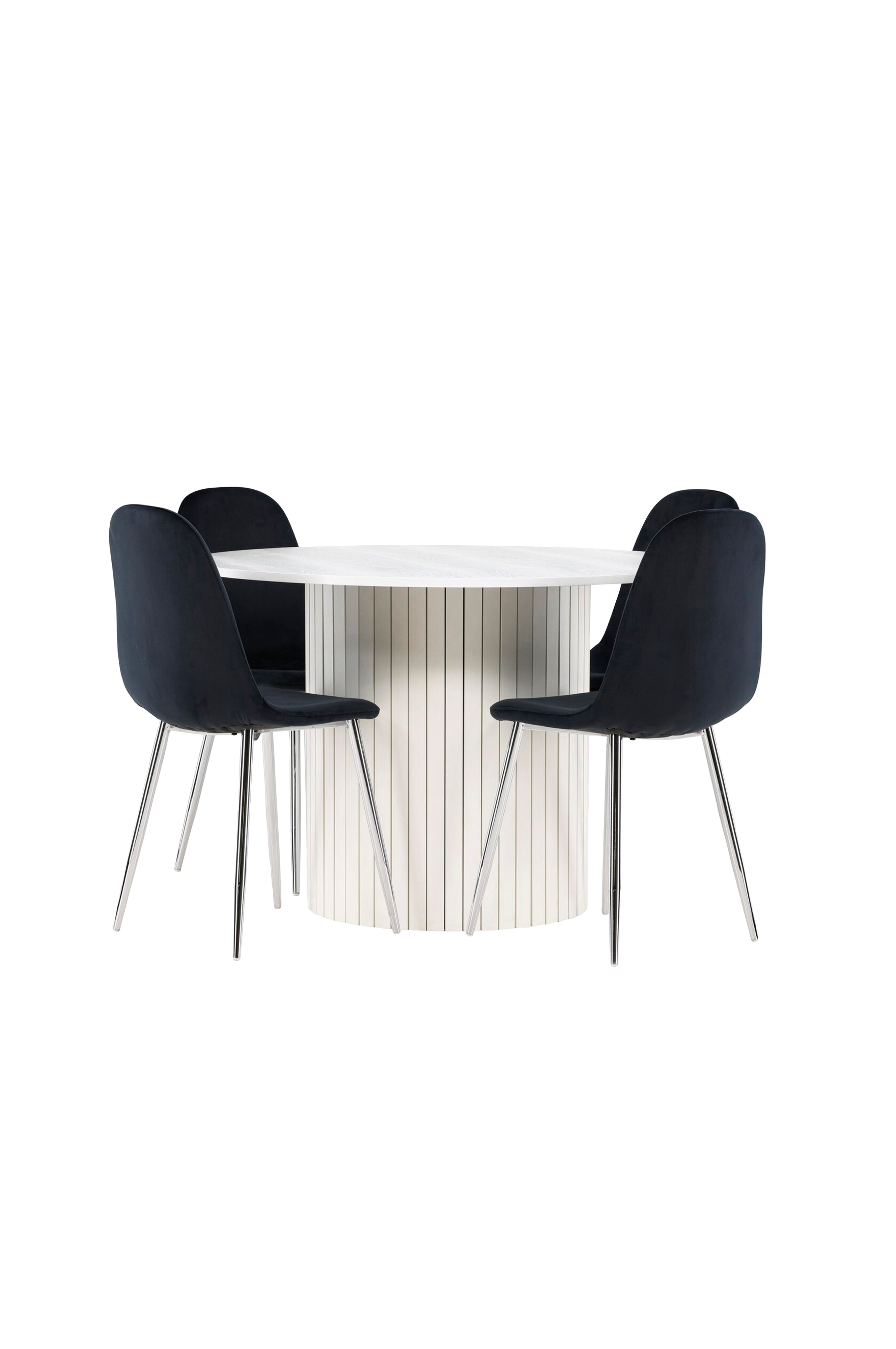 Skapa en elegant och inbjudande matplats med vår eleganta matgrupp som kombinerar det moderna Häron-bordet med de lyxiga Polar-stolarna. Denna matgrupp är perfekt för både vardagsmiddagar och festliga tillfällen och ger din matsal en sofistikerad och modern känsla. Häron-bordet är tillverkat av mdf och ger en ljus och fräsch atmosfär till din matsal. Med en diameter på 110 cm erbjuder bordet gott om utrymme för mat och samtal, samtidigt som dess runda form skapar en harmonisk och balanserad miljö. Bordets robusta konstruktion garanterar långvarig användning och stabilitet. De fyra polarstolarna kompletterar bordet perfekt med sina eleganta sammetssitsar. Dessa stolar erbjuder både komfort och stil, vilket gör dem idealiska för långa, trevliga middagar med familj och vänner. Deras moderna design med höga ryggar och mjuka sitsar ger din matsal en sofistikerad och modern touch. Denna matgrupp är en perfekt blandning av estetik och funktionalitet, vilket gör den till ett utmärkt val för dig som vill ha en elegant och bekväm matplats. Uppgradera din matsal med en kombination av Häron-bordet och Polar-stolarna och skapa en plats där minnen och glädje delas.
