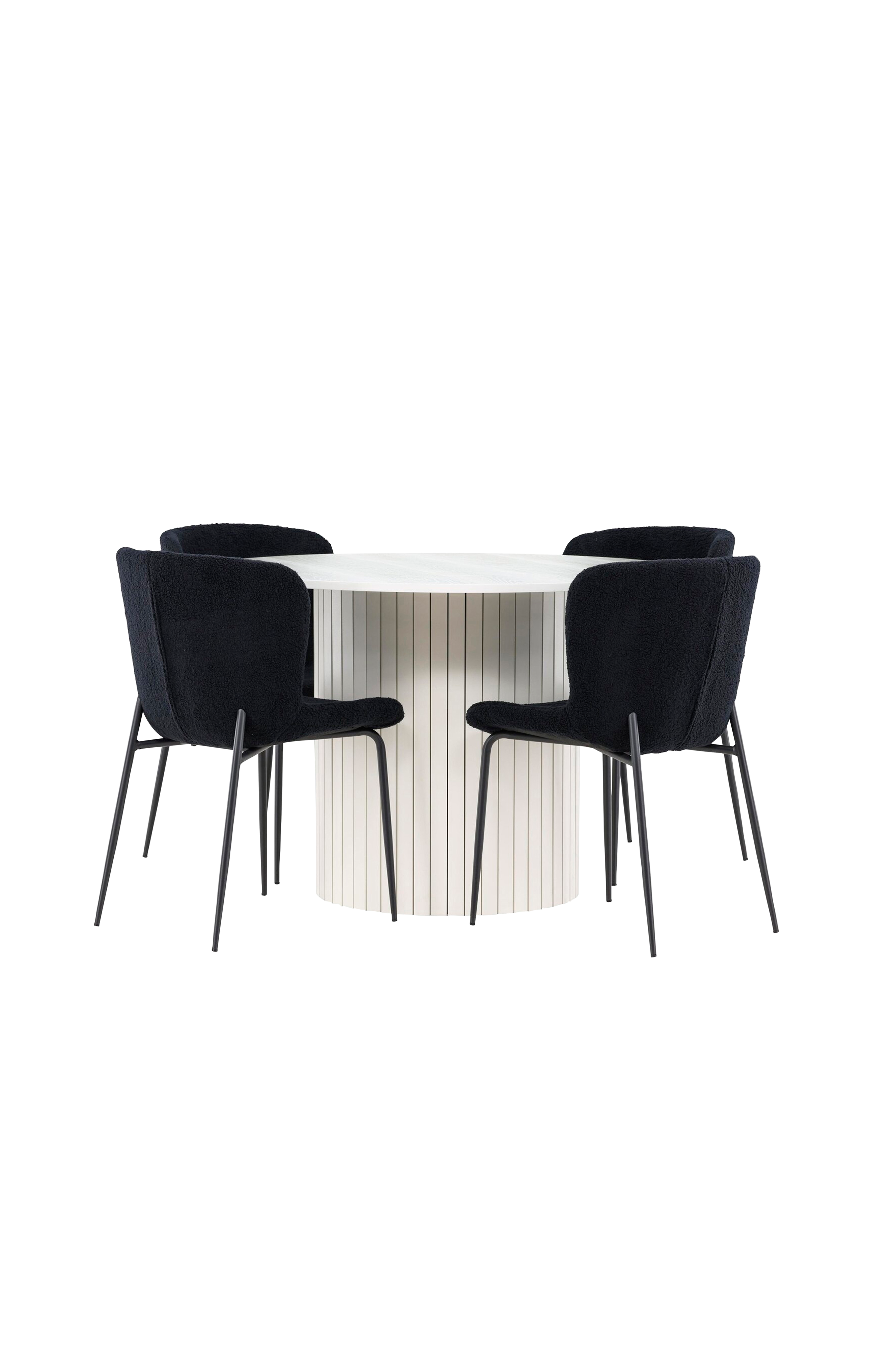 Skapa en elegant och inbjudande matplats med vår eleganta matgrupp som kombinerar det moderna Häron-bordet med de bekväma Modesto-stolarna. Denna matgrupp är perfekt för både vardagliga middagar och festliga tillfällen och ger din matsal en sofistikerad och modern känsla. Häron-bordet, som är tillverkat av mdf, har en finish som ger en ljus och fräsch atmosfär till din matsal. Med en diameter på 110 cm erbjuder bordet gott om utrymme för mat och samtal, samtidigt som dess runda form skapar en harmonisk och balanserad miljö. Bordets robusta konstruktion garanterar långvarig användning och stabilitet. De fyra Modesto-stolarna kompletterar bordet perfekt med sina eleganta sitsar klädda i polyesterteddy. Dessa stolar erbjuder både komfort och stil, vilket gör dem idealiska för långa, trevliga middagar med familj och vänner. Deras moderna design med höga ryggstöd och mjuka sitsar ger din matsal en sofistikerad och modern touch. Denna matgrupp är en perfekt blandning av estetik och funktionalitet, vilket gör den till ett utmärkt val för dig som vill ha en elegant och bekväm matplats. Uppgradera din matsal med kombinationen av Häron-bordet och Modesto-stolarna och skapa en plats där minnen och glädje delas.