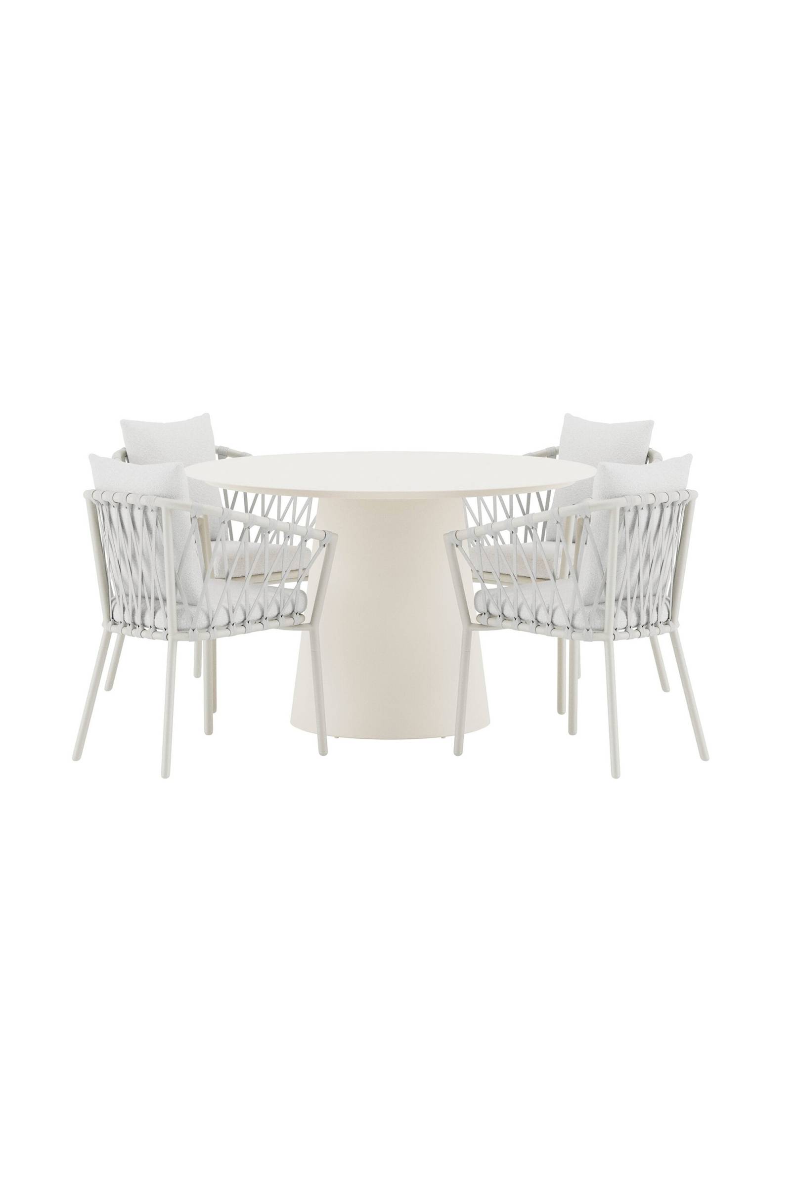 Skapa en inbjudande och elegant uteservering med matgruppen linos & lanzo. Matstolen linos kombinerar en varm beige ton med mjuka vita bouclé-dynor som ger en lyxig och omslutande känsla. Den vävda ramen skapar ett luftigt, modernt uttryck, medan de generösa dynorna gör stolen underbart bekväm - perfekt för långa middagar och avkopplande stunder runt bordet. Matbordet lanzo kompletterar stolarna med sin eleganta, runda form i beige aluminium. Den minimalistiska designen ger ett harmoniskt och tidlöst intryck, medan den rymliga bordsskivan gör det enkelt att samla vänner och familj för såväl vardagliga måltider som juliga tillfällen. Tillsammans bildar stolarna linos och matbordet lanzo en smakfull och modern matgrupp som förskönar varje uteplats eller terrass - en perfekt balans mellan komfort, elegans och modern design.