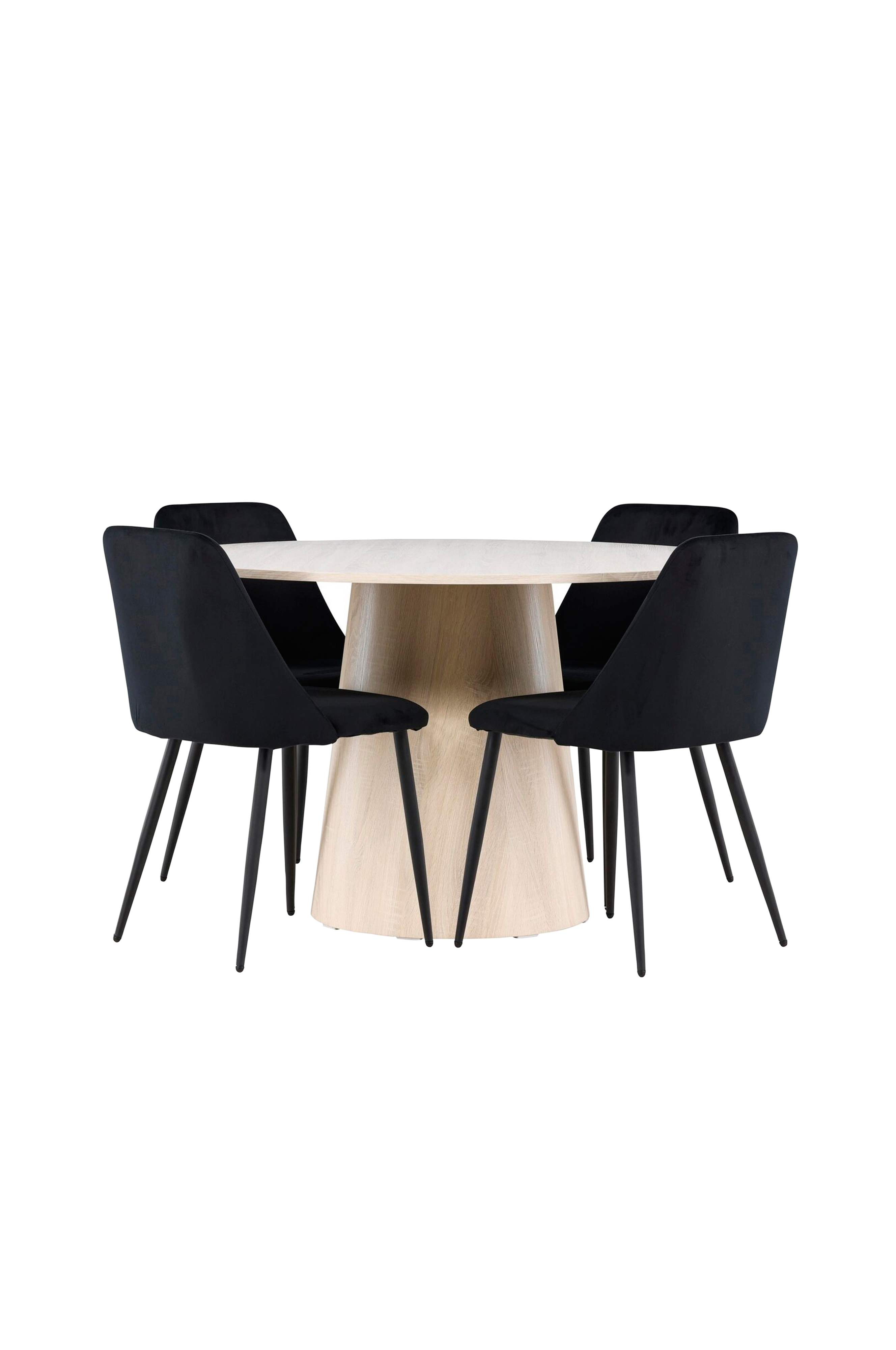 Skapa en elegant och inbjudande matplats med vår sofistikerade matgrupp som kombinerar det eleganta lanzo-bordet med de lyxiga night-stolarna. Denna matgrupp är perfekt för både vardagsmiddagar och festliga tillfällen och ger din matsal en modern och harmonisk atmosfär. Lanzo-bordet, tillverkat av mdf, ger en ren och inbjudande känsla till din matsal. Med en generös diameter på 120 cm erbjuder bordet gott om utrymme för mat och samtal, samtidigt som dess runda form skapar en balanserad och social miljö. Bordets robusta konstruktion garanterar långvarig användning och stabilitet. De fyra nattfåtöljerna kompletterar bordet perfekt med sina eleganta sitsar klädda i sammet. Dessa stolar erbjuder både komfort och stil, vilket gör dem idealiska för långa, trevliga middagar med familj och vänner. Deras moderna design med höga ryggstöd och mjuka sitsar ger din matsal en sofistikerad och modern touch. Denna matgrupp är en perfekt kombination av estetik och funktionalitet, vilket gör den till ett utmärkt val för dig som vill ha en elegant och bekväm matplats. Uppgradera din matsal med en kombination av lanzo-bordet och nattstolarna och skapa en plats där minnen och glädje delas.