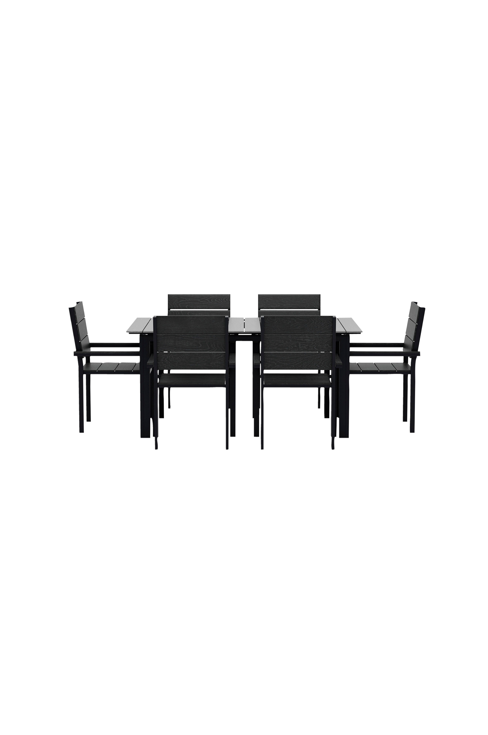 Skapa en snygg och praktisk utemiljö med denna moderna matgrupp från levels-serien. Fåtöljen levels är tillverkad i svart aluminium med sits och rygg i slankt aintwood, vilket ger stolen ett modernt nordiskt uttryck. Den är robust, bekväm och stapelbar, vilket gör förvaringen enkel och bekväm. En perfekt stol för många härliga sommarmiddagar. Matsalsbordet levels är ett rektangulärt och utdragbart bord som ger gott om plats när sällskapet växer. Bordsskivan i grå aintwood och den robusta metallramen skapar ett hållbart och tidlöst bord som är perfekt för utomhusbruk.