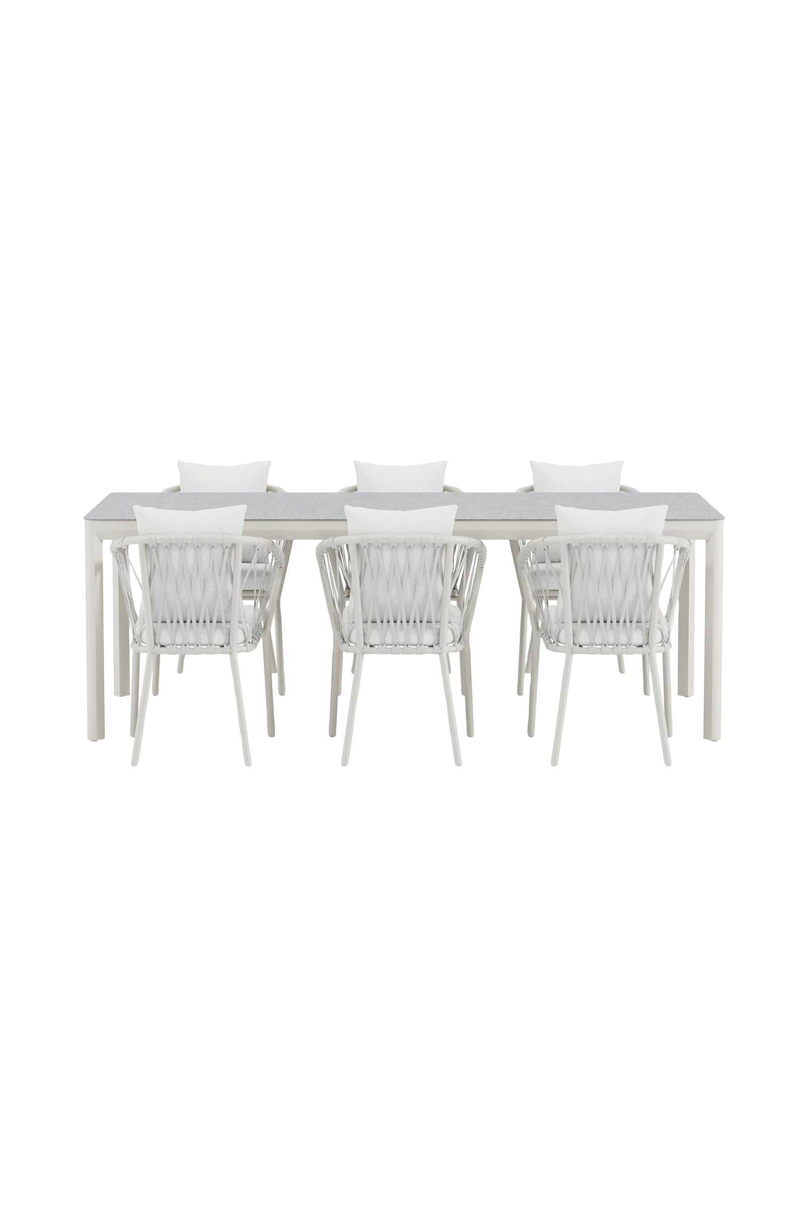 Skapa en elegant och harmonisk uteservering med denna eleganta kombination av matstolarna linos och det moderna matbordet lino. Matstolen linos kombinerar sofistikerad design med hög komfort. Den beige vävda ramen ger ett luftigt och exklusivt utseende, medan de mjuka vita bouclé-dynorna ger en inbjudande sittupplevelse. Stolen är perfekt för långa middagar och skapar en varm, modern och tidlös atmosfär runt bordet.