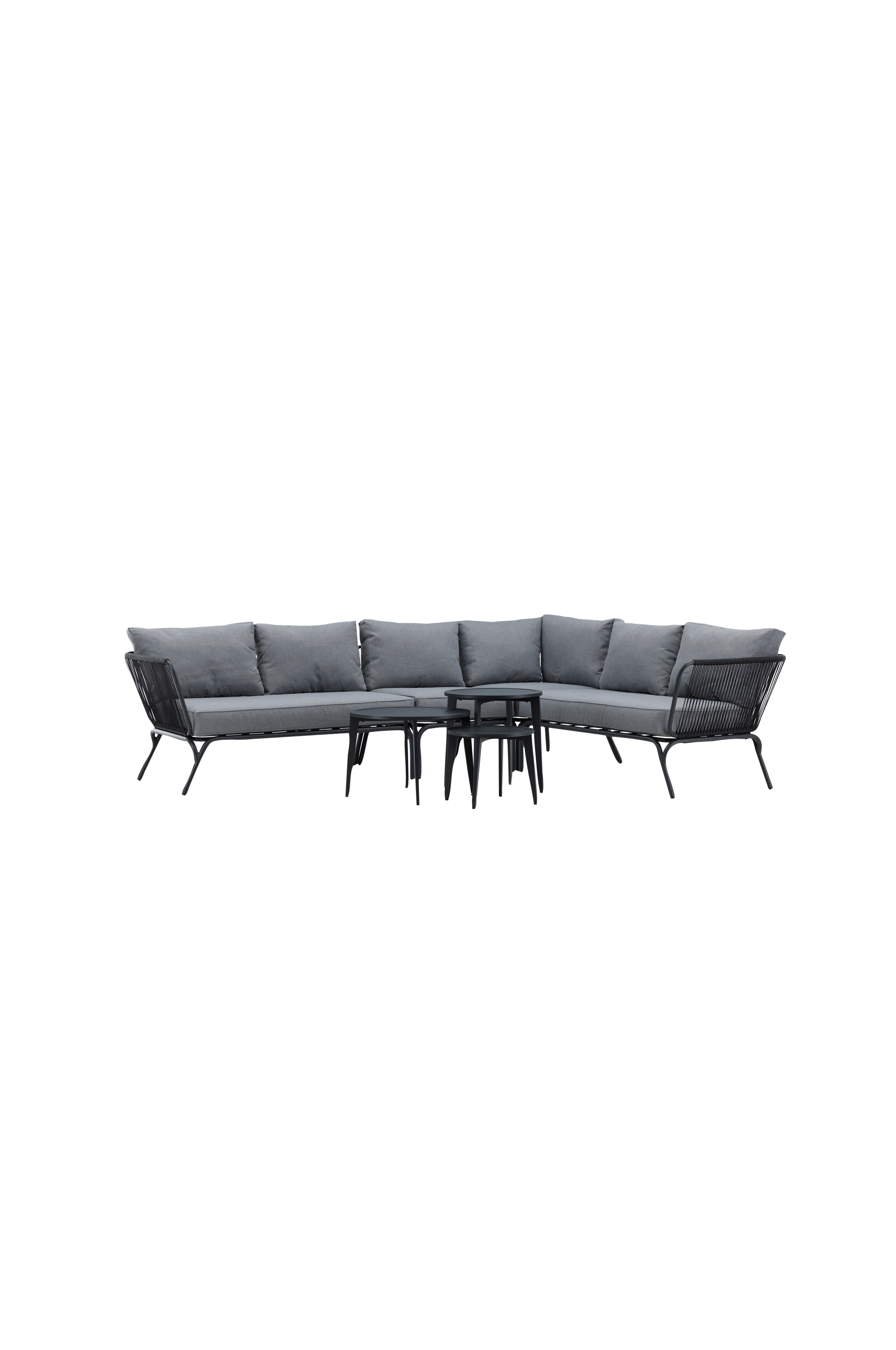 Skapa en mysig plats att samla nära och kära kring i sommar – här sitter ni avkopplat och bekvämt i timmar! Roxo är en trendig soffgrupp i stilren design som passar utmärkt till uteplatsen eller uterummet. Soffgruppen består av en hörnsoffa med 6 sitsplatser och en hörndel, tillverkat i en slitstark design i aluminium med en rygg som är designad i rep samt stilrena satsbord i tre delar med toppskivor ialuminium. Mjuka dynor ingår till soffgruppen.