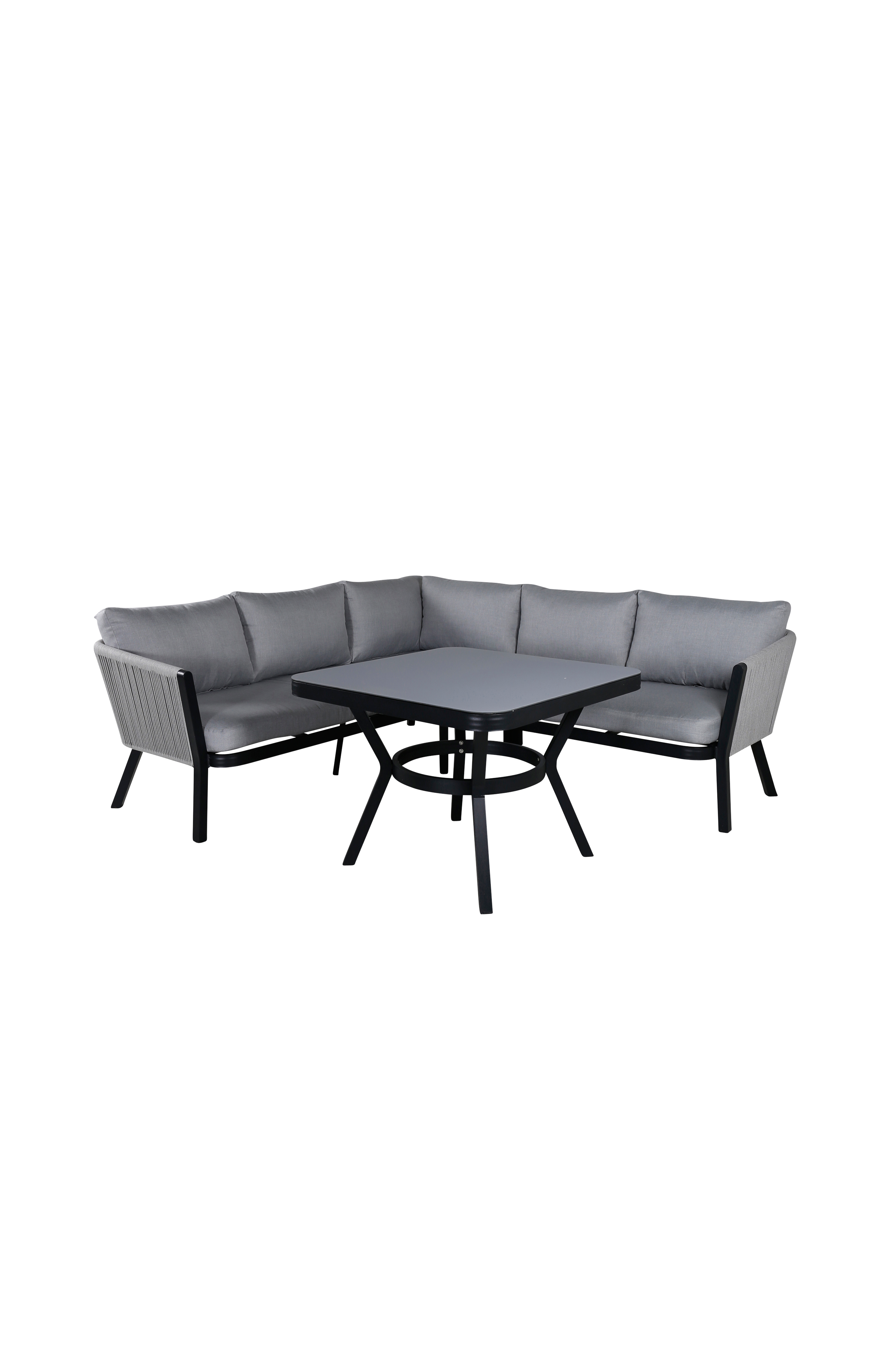 Virya Soffgrupp är en skön och snygg grupp i aluminium med tillhörande bord som har en toppskiva i glas. Slitstarka dynor ingår och gruppen rymmer totalt 5 sittande gäster. Enklare montering krävs. Bjud hem familj och vänner för bekväma och trivsamma stunder i sommar!