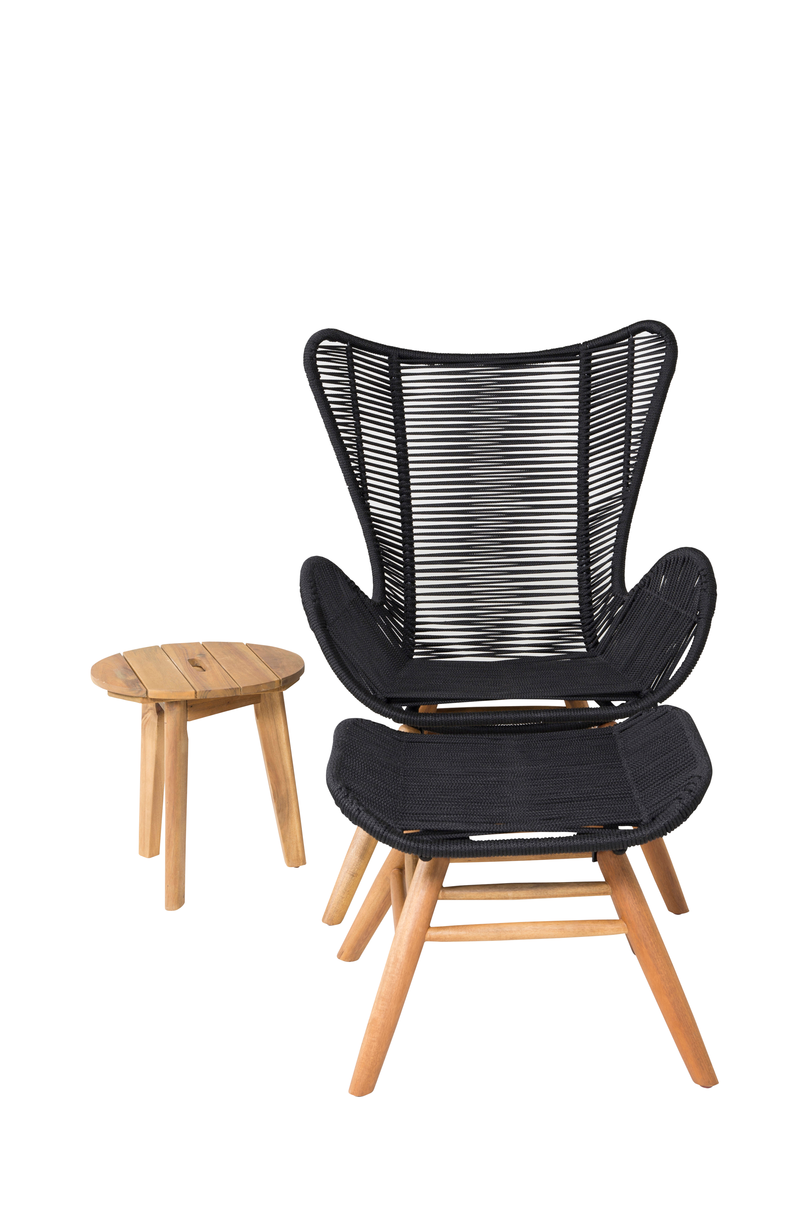 Tinka lounge stol i rep och acaica och tillsammans med en fotpall. Stolens mått: Totalhöjd: 102,5cm, Bredd: 72cm, Djup: 78cm, Sitthöjd: 42,5cm. Tillsammans med 1st Celine sidobord med en rund topp i acacia och bordsben i acacia. Bordetsmått: Diameter: 40cm, Höjd: 42cm. Bord och stol kräver enklare montering.