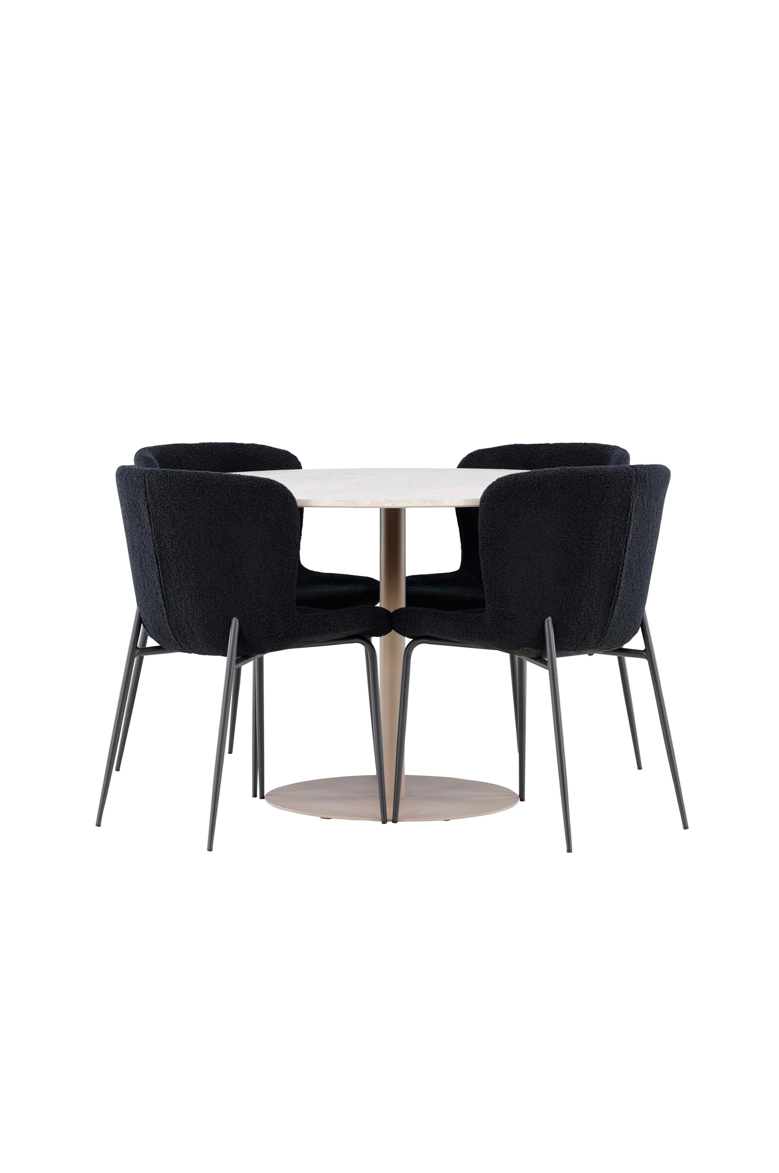 Uppgradera din matsal med den eleganta och moderna matgrupp som består av Lycke-bordet och Modesto-stolarna. Denna matgrupp kombinerar stil och komfort, vilket gör den till ett perfekt komplement till ditt hem. Lycke-bordet imponerar med sin sofistikerade design och mdf-konstruktion. Med en diameter på 110 cm erbjuder bordet gott om utrymme för måltider och sociala sammankomster, medan dess harmoniska design ger en lugn och elegant touch till din matsal. Den slitstarka ytan gör bordet lätt att rengöra och underhålla, vilket garanterar långvarig skönhet och funktionalitet. De fyra medföljande Modesto-stolarna kompletterar bordet perfekt. Stolarna är klädda i mjuk polyesterteddy, vilket ger en lyxig och bekväm sittupplevelse. Teddymaterialet är känt för sin värme och mjukhet, vilket gör att du och dina gäster kan sitta bekvämt under långa middagar och samtal. Benen på stolarna ger en stabil konstruktion samtidigt som de förstärker stolarnas moderna och eleganta utseende. Lycke matgrupp med Modesto-stolar är det perfekta valet för dig som vill skapa en snygg och funktionell matmiljö. Kombinationen av modern design och hög komfort gör varje måltid till en njutbar upplevelse. Välkommen till en ny nivå av stil och komfort i ditt hem med lycke och modesto!