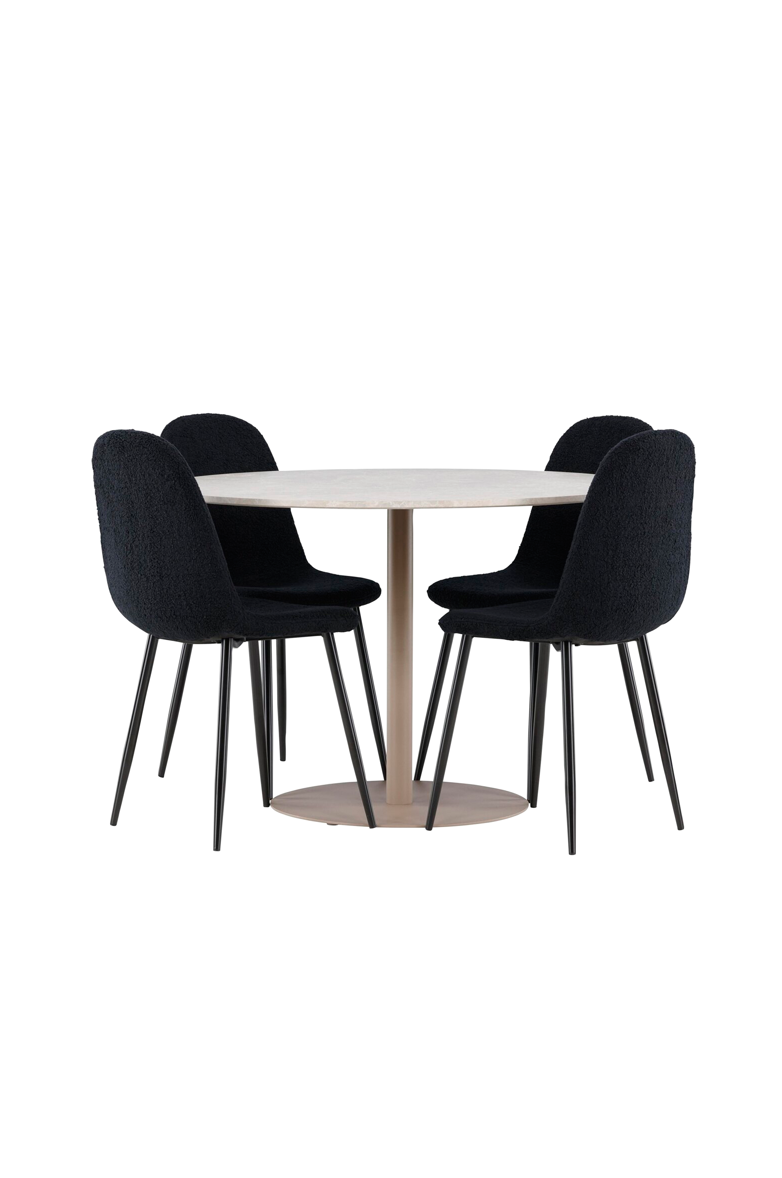 Förvandla din matsal med den eleganta och moderna matgrupp som består av Lycke-bordet och Polar-stolarna. Denna matgrupp är utformad för att kombinera stil och komfort, vilket gör den till ett fantastiskt komplement till ditt hem. Lycke-bordet är en imponerande mittpunkt med sin sofistikerade design och mdf-konstruktion. Med en diameter på 110 cm erbjuder bordet gott om utrymme för måltider och sociala sammankomster, samtidigt som den harmoniska designen ger en modern och elegant touch till din matsal. Den slitstarka ytan gör bordet lätt att rengöra och underhålla, vilket säkerställer dess långvariga skönhet och funktionalitet. De fyra medföljande polarstolarna kompletterar bordet perfekt. Stolarna är klädda i mjuk polyesterteddy, vilket ger en lyxig och bekväm sittupplevelse. Teddymaterialet är känt för sin värme och mjukhet, vilket gör att du och dina gäster kan sitta bekvämt under långa middagar och samtal. Benen på stolarna ger en stabil konstruktion samtidigt som de förstärker stolarnas moderna och eleganta utseende. Lycke matgrupp med polarstolar är det perfekta valet för dig som vill skapa en snygg och funktionell matmiljö. Kombinationen av modern design och hög komfort gör varje måltid till en njutbar upplevelse. Välkommen till en ny nivå av stil och komfort i ditt hem med lycke och polar!