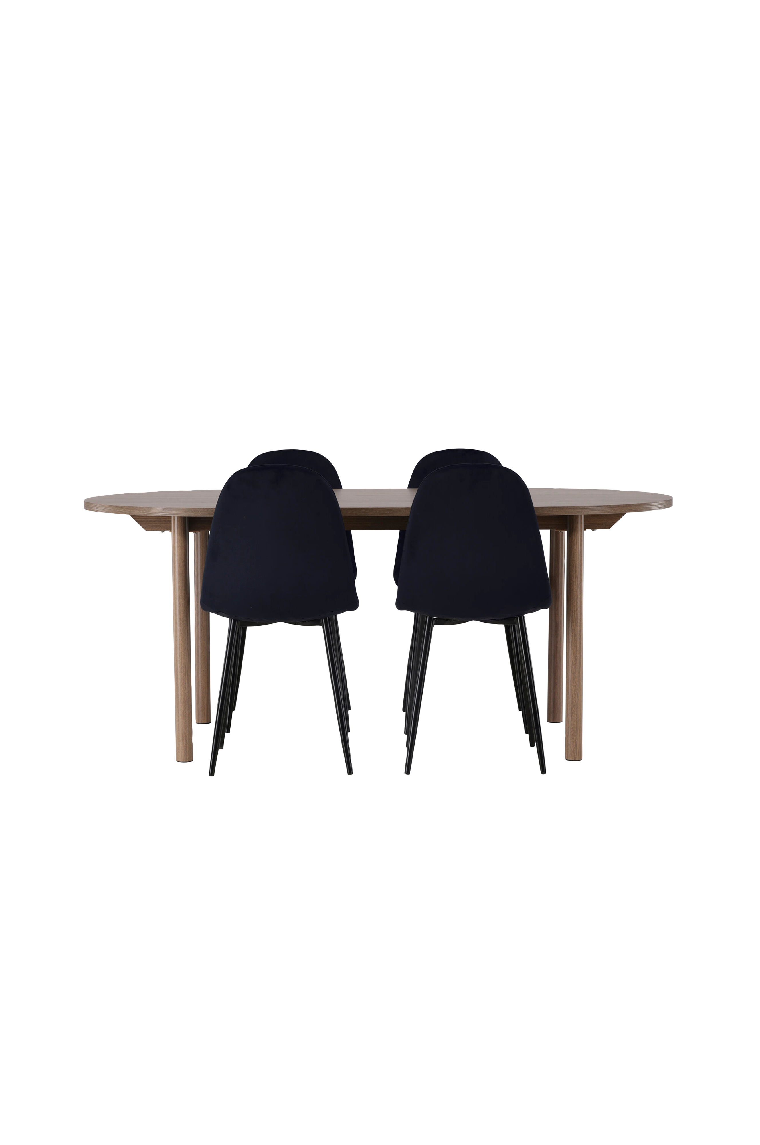 Denna matgrupp innehåller fyra stolar, vilket gör den idealisk för mindre sammankomster och familjemiddagar. Med sin skandinaviska design och sitt slående utseende blir denna ensemble en elegant inredningsdetalj som förhöjer atmosfären i hela rummet. Perfekt för att skapa en elegant och inbjudande matsalsmiljö.