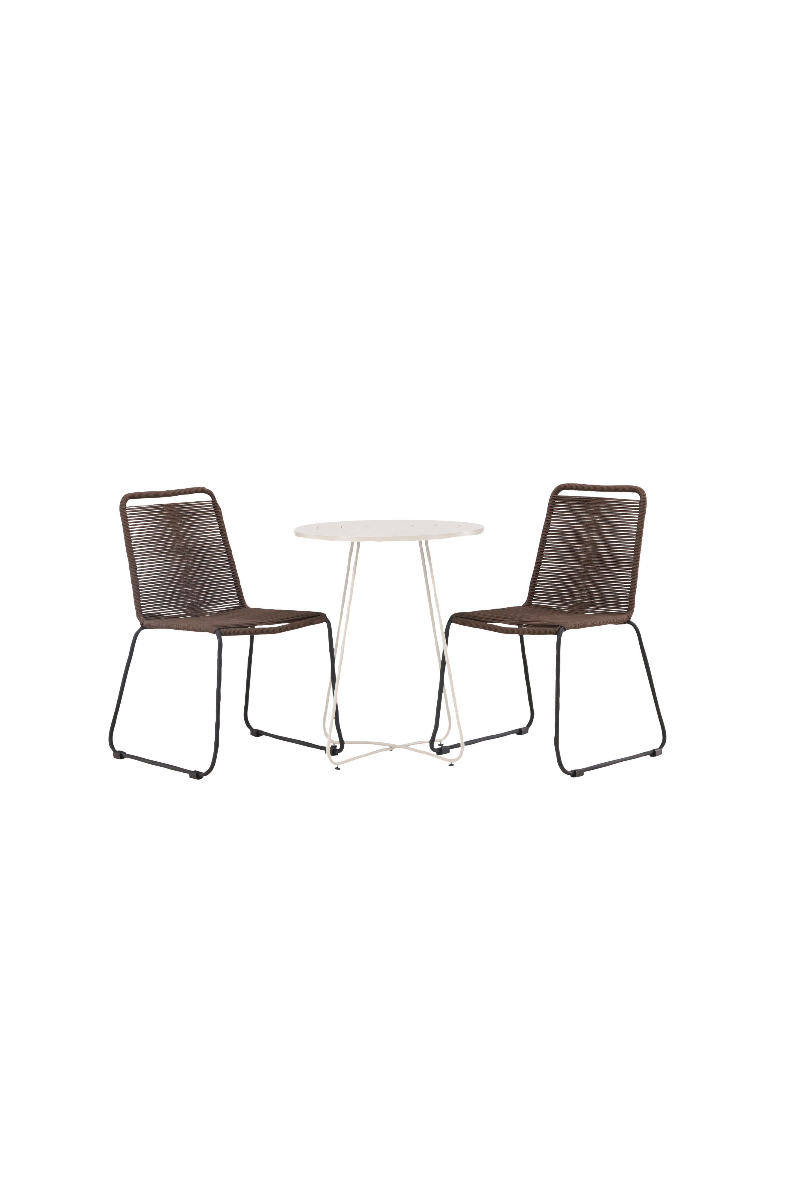En charmig matgrupp i jordnära kulörer! Det nätta cafébordet från serien bacong har en rund toppskiva och smala ben i stål. Här tillsammans med 2st matstolar från serien lindos. Stolen är i slitstarkt rep i kulör och passar utmärkt för utomhusbruk. Duka ut fikan på den lilla balkongen eller uteplatsen i sommar - det ska kännas skönt att slå sig ner en stund!