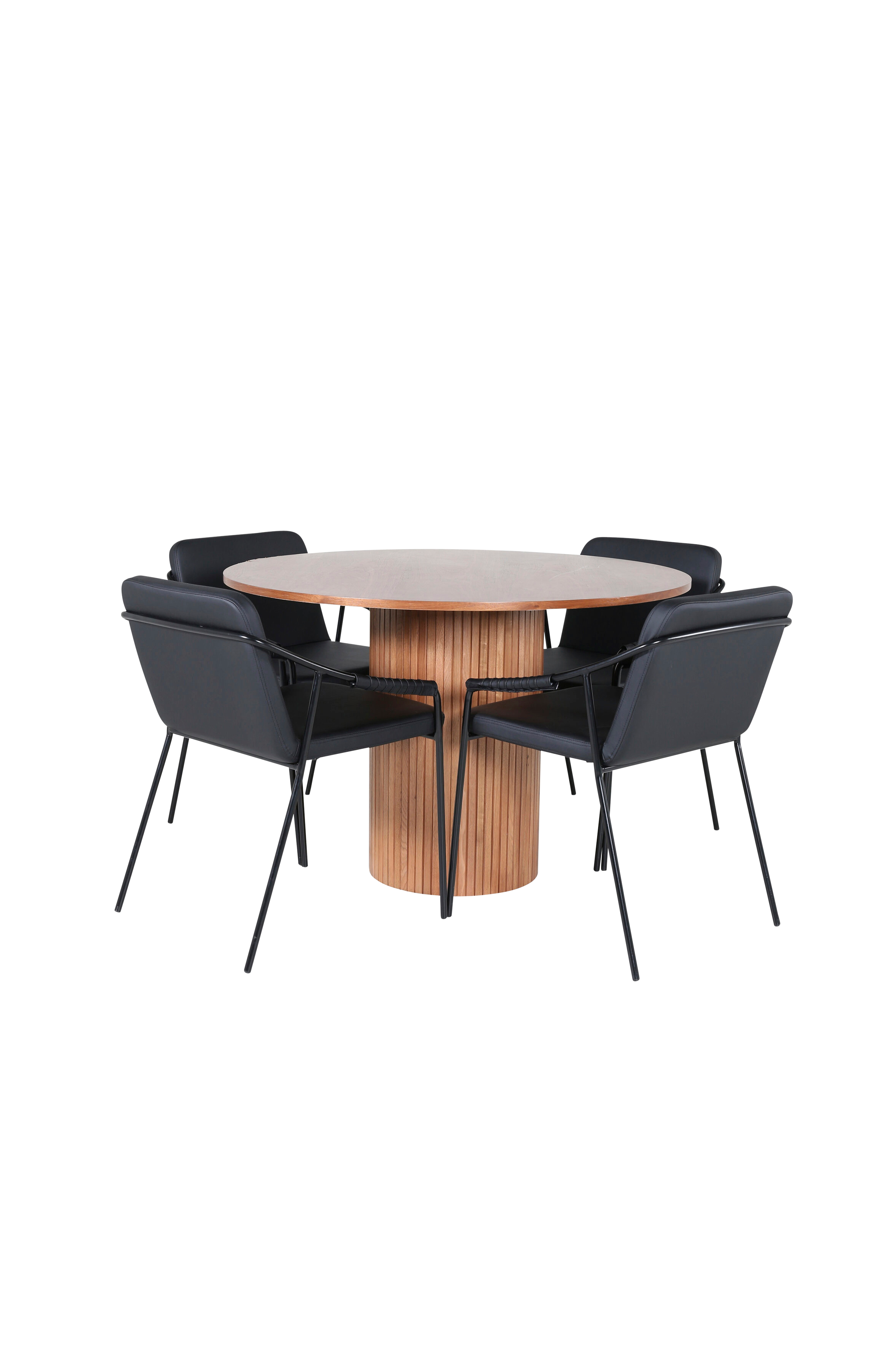 En läckert matchande matgrupp i modern design - vad mer kan man önska? Kring det runda matbordet bianca skapar du en härlig gemenskap där ingen riskerar hamna på kanten. Bordsskivan är tillverkad i mdf och har en cylinderformad stomme i robust utformning och ribbad design. Den trendiga valnötskulören är lika tidlös som snygg och enkeltt matcha med övrig inredning. Kombineras här med 4st stolar från serien tvist. Stolarna har en sits och rygg i polyuretanskinn och polyester samt stolsben i järn. Njutv dagens alla måltider!