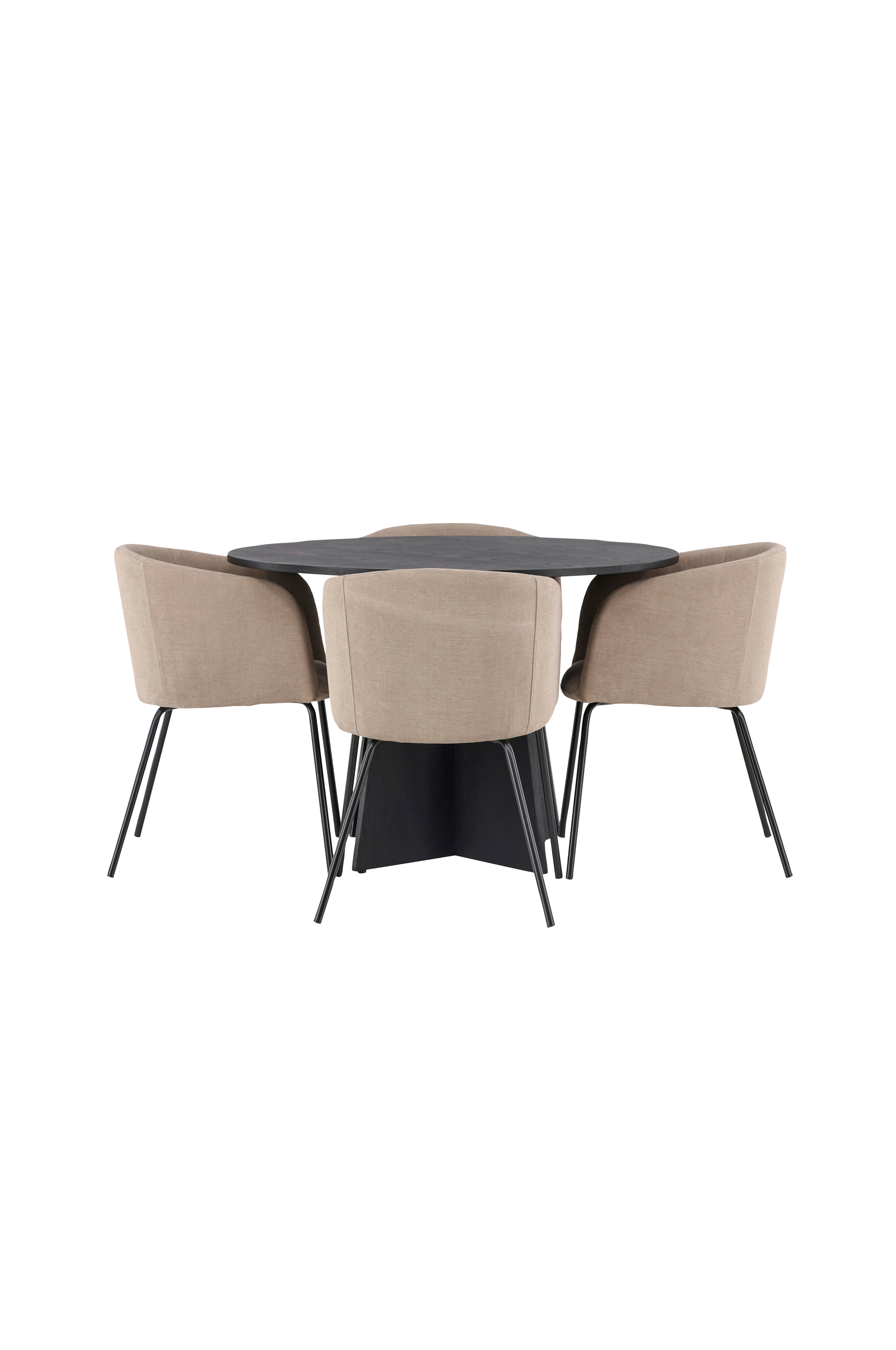 En smakfull kombination av bekvämlighet och charmiga former! Det runda matbordet bootcut har en bordsskiva i mdf med faner och en designrik stomme som ger ett läckert intryck till helhetsbilden. Här tillsammans med bekväma matstolar berit. Stolen har en helklädd design med lätt rundad rygg och sits i sammetstyg och polysterlinne samt smala stolsben i järn. Låt tiden här bli njutbar för hela familjen!