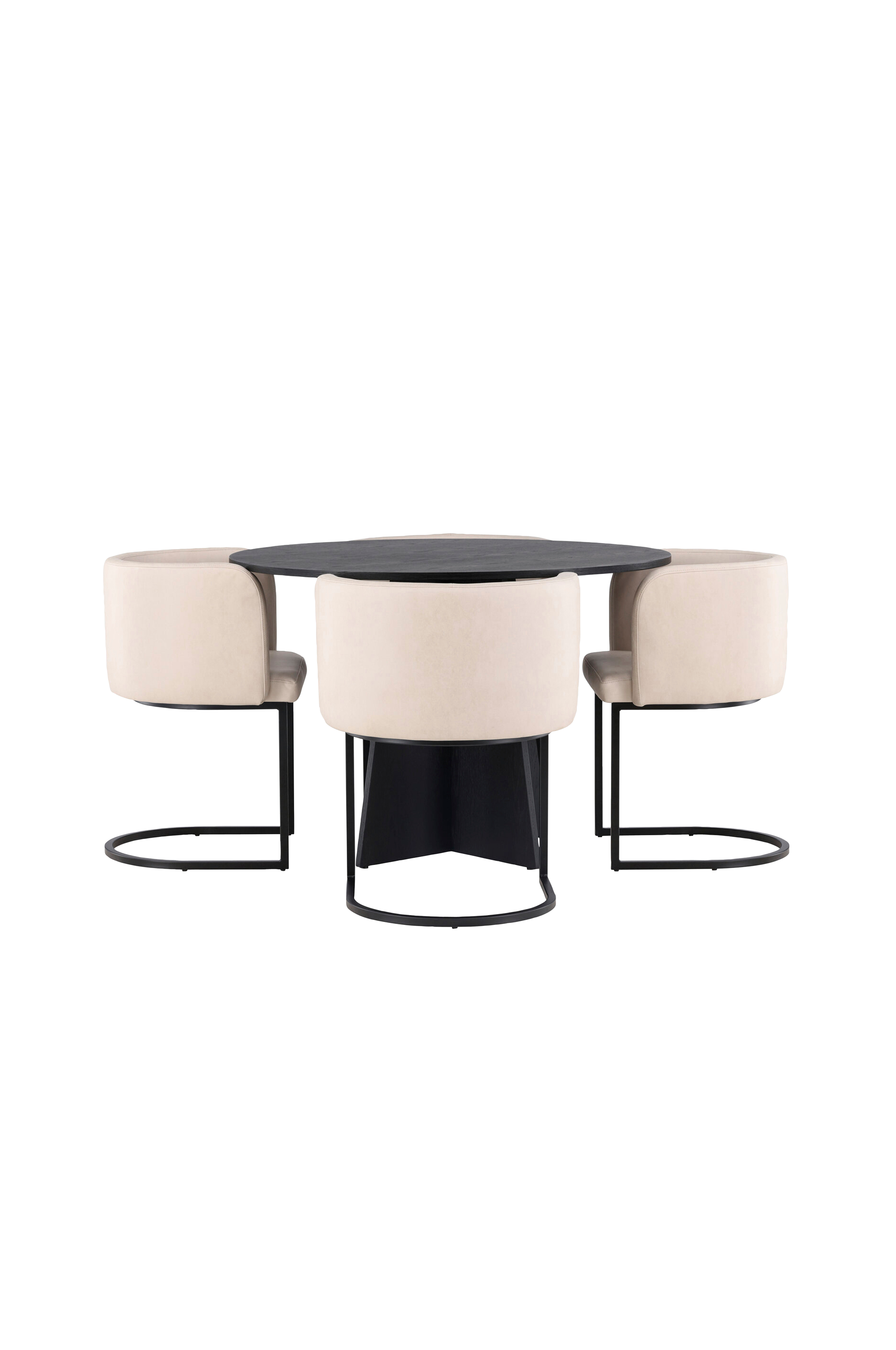 Möblera lyxigt och pampigt! Det runda matbordet bootcut i genomgående kulör har en bordsskiva i mdf med faner och en designrik stomme som ger ett läckert intryck till helhetsbilden. Här tillsammans med eleganta matstolar från serien simrishamn. Stolen har en helklädd sits med ett rundat ryggstöd i tc-tyg och dekorativ, minimalistisk benstomme i stål. Sitt bekvämt och njut tillsammans med nära och kära! Bordets mått: 110cm.