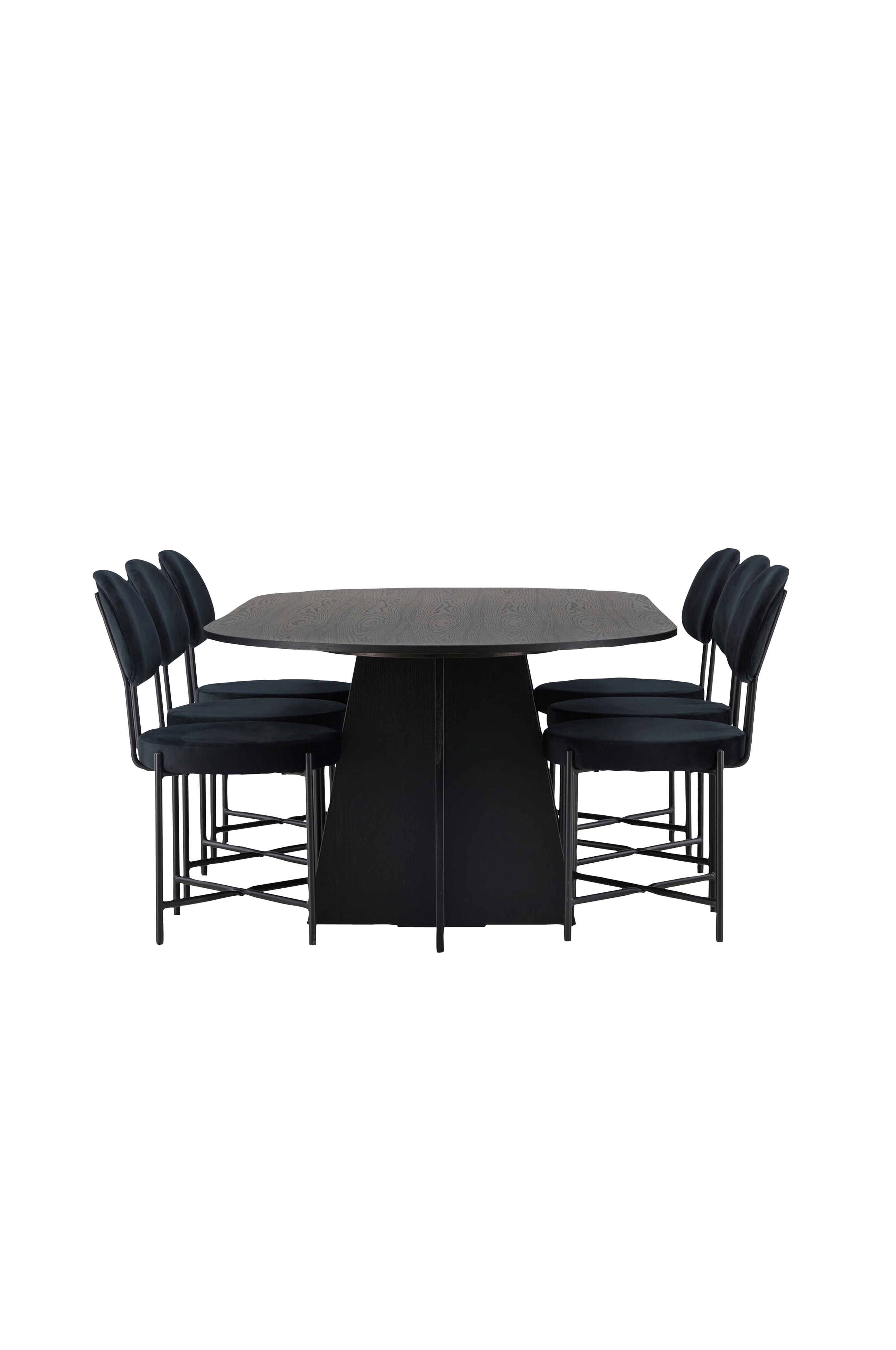 det ovala matbord från serien bootcut har en robust design som imponerar. Den ovala bordsskivan, tillverkad av mdf med faner, är en perfekt kombination av modernitet och tradition. Dess tunna profil skapar ett minimalistiskt intryck och ger en smakfull kontrast till den robusta stommen med sina två konformade ben i en öppen design. Här tillsammans med fantastiska matstolar från serien stella. Den här stolen är inte bara en fröjd för ögat, den är också otroligt bekväm. Med sin trendiga och skandinaviska design erbjuder den rundade sitsen och stolsryggen i sammetstyg en touch av lyx och elegans. De minimalistiska stolsbenen i stål kompletterar perfekt den moderna estetiken och skapar en balanserad harmoni i rummet.
