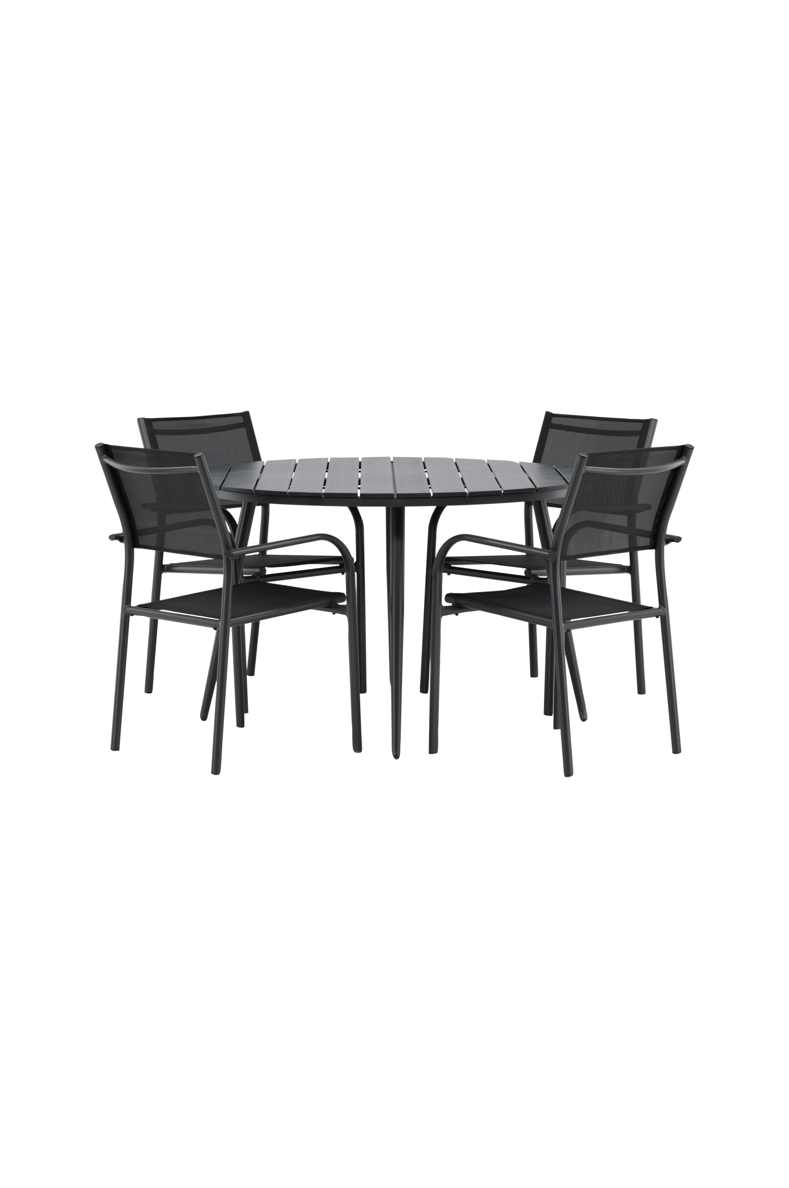 En rund matgrupp som kombinerar tidlös design med inbjudande former! Matbord Break har en rund bordsskiva i aintwood och lätt utsvängda ben i aluminium. Här i perfekt kombination med Venture Homes omtyckta matstolar från serien Santorini. Stolarna har raka nordiska former med integrerade armstöd i aluminium och en sits i textilene. De är också stapelbara för praktisk förvaring. Låt tiden här bli dagens höjdpunkt!