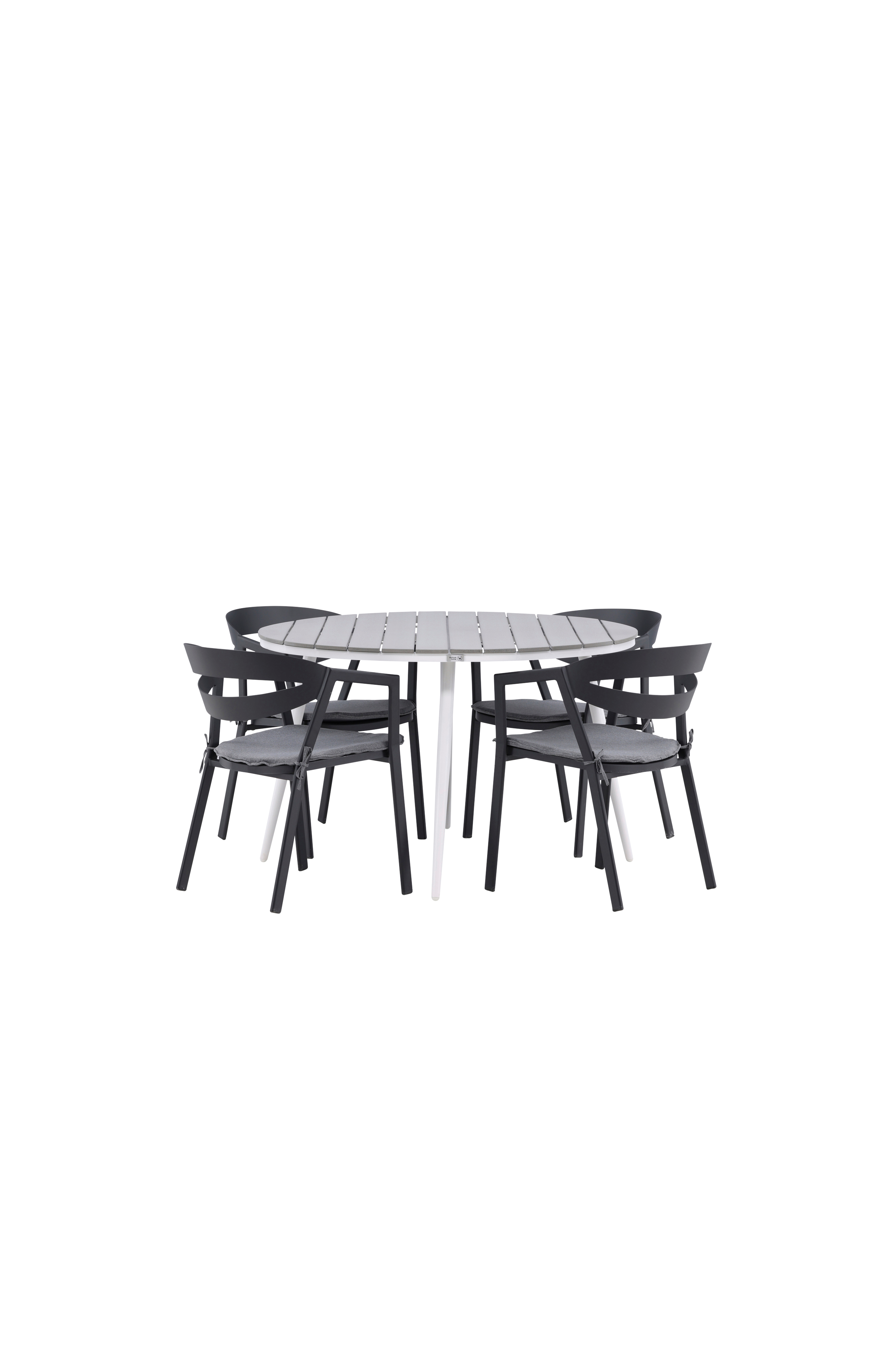 En rund matgrupp som kombinerar tidlös design med inbjudande former! Matbord Break har ett klassiskt utförande med en rund bordsskiva i aintwood och lätt utsvängda ben i aluminium. Här i perfekt kombination med bekväma matstolar från serien Slit. Stolarna har integrerade armstöd i aluminium och en dyna för extra komfort. Skapa den perfekta fikaplatsen på din altan!