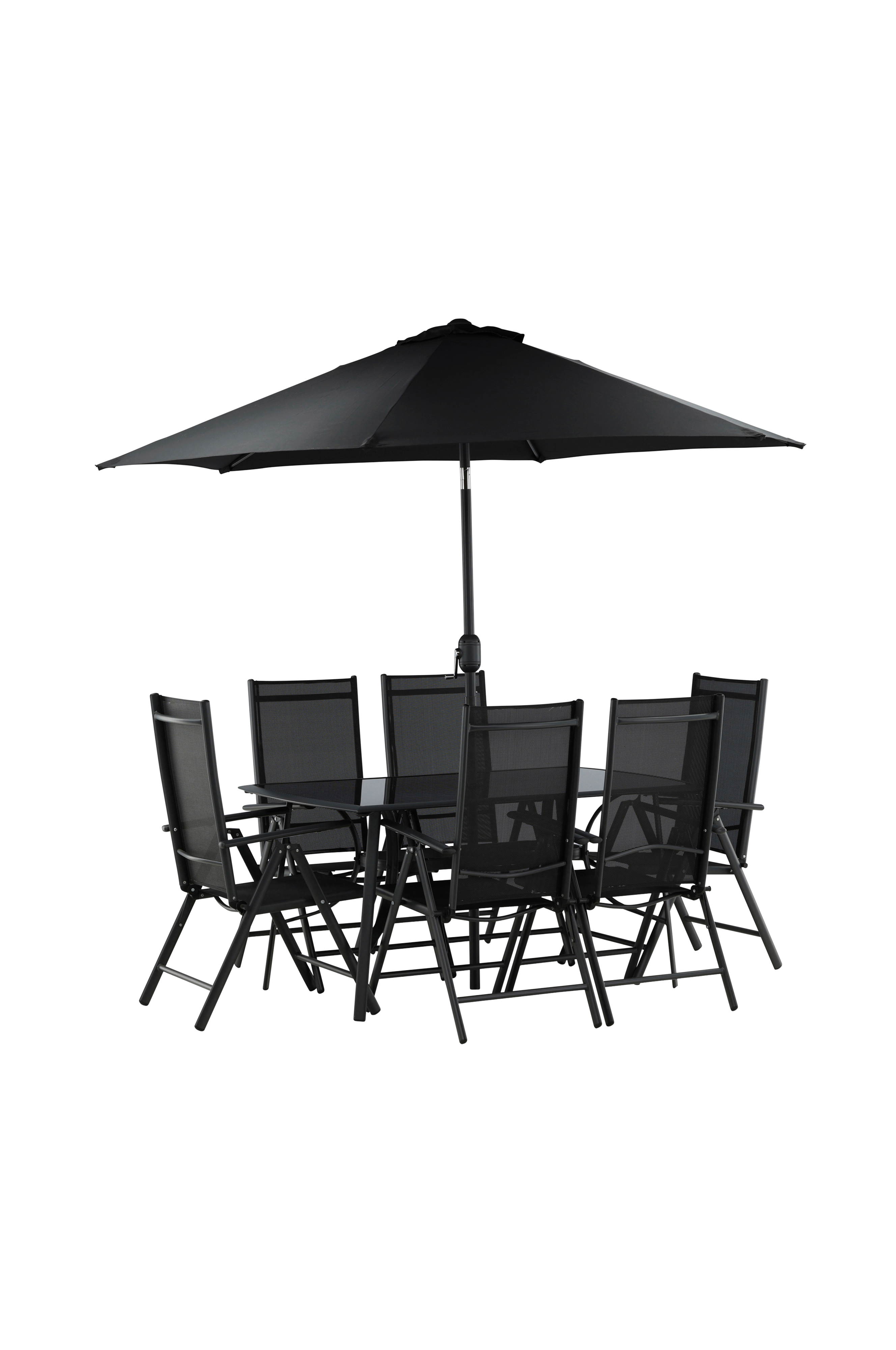 Svalka dig i skuggan ett tag i en modern matgrupp under ett smart parasoll! Matgruppen Brekki bjuder både på ett stilrent matbord med en bordsskiva i glas och raka ben i aluminium. Här tillsammans med fällbara matstolar med en sits i textilene och ram i aluminium. Parasollet sätts fast i mitten av bordet och är till för att skydda dig från solens varma strålar vid middagsbordet. Parasollet har ett t tyg med en stomme i aluminium. Det blir inte bättre än såhär!