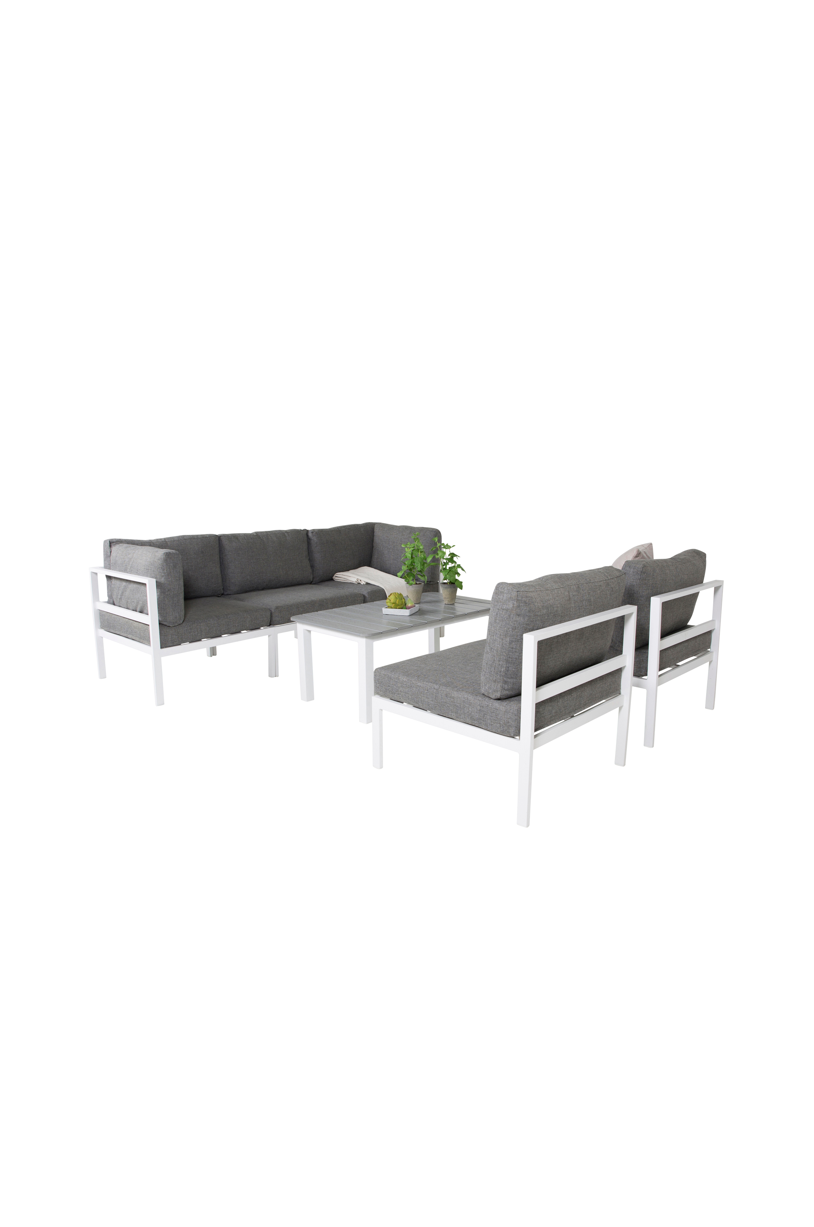 Cassie modulsoffa med 2st Cassie hörndelar i aluminium med dynor i polyester. Hörndelens mått: Totalhöjd: 65,5cm, Bredd: 74cm, Djup: 74cm, Höjd: 30cm. Tillsammans med 3st Cassie mittdelar i aluminium och sittdynor i polyester. Mittdelens mått: Totalhöjd: 65,5cm, Bredd: 74cm, Djup: 74cm, Höjd: 30cm. Inkluderat är ett Pascal soffbord med topp i aintwood och bordsben i aluminium. Bordetsmått: Längd: 110cm, Bredd: 62cm, Höjd: 45cm.Soffgruppen kräver enklare montering.