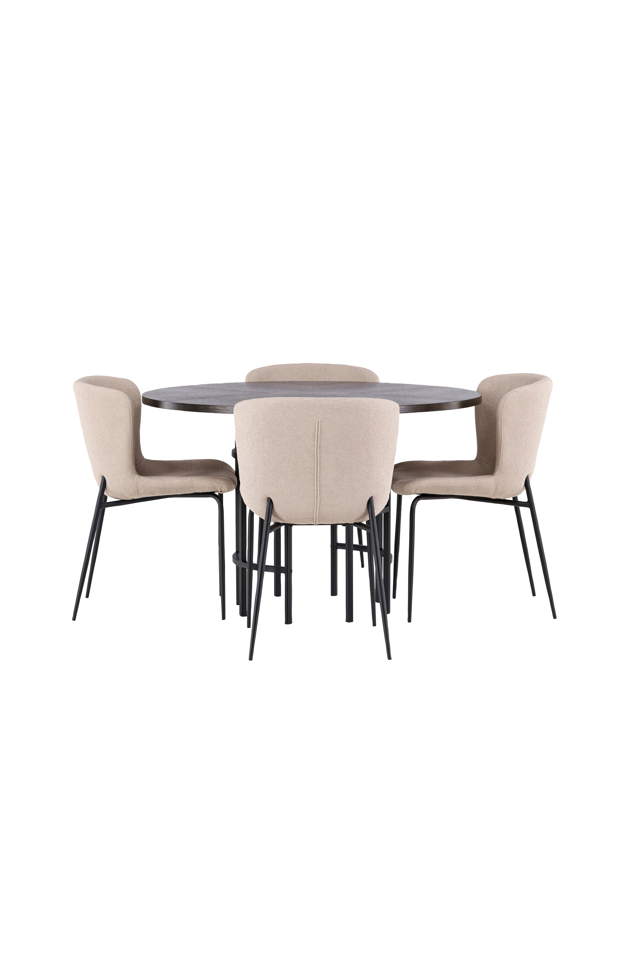 En matgrupp enligt alla önskemål! Det runda matbordet copenhagen har en vacker brunfärgad bordsskiva i mdf med faner och ett dekorativt, cylinderformat underrede i metall. Här tillsammans med modemedvetna matstolar från serien modesto. Stolen är helklädd i lurvigt tyg med stilrent smala stolsben i metall. Den lätt rundade ryggen och stoppade sittdynan ger extra komfort och förlänger trivsamma måltider kring matbordet. Det blir inte bättre än såhär! Bordets mått: 115cm.