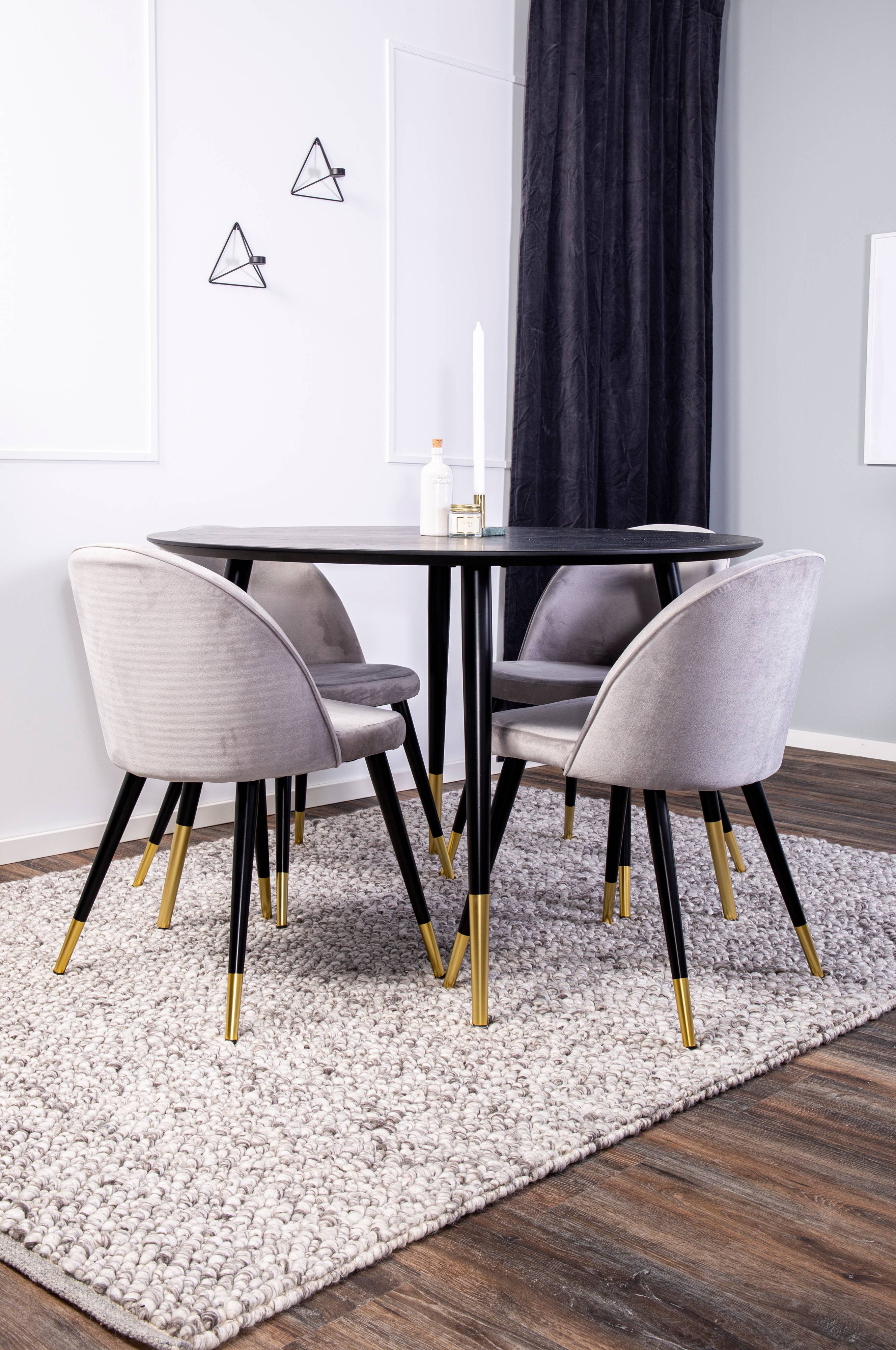 Doris matgrupp med ett runt stilrent matbord med en pulverlackerad MDF skiva som bordsskiva och mässingfärgade detaljer på benen. Diameter 115, höjd 75 cm. Matchas med 4 st stolar klädda i sammetstyg och med mässingsdetaljer på stolsbenen. Mått Höjd 77, djup 54,5, bredd 49,5 cm. Sitthöjd 47, sitt djup 43 cm. Bordet och stolarna kräver enklare montering.