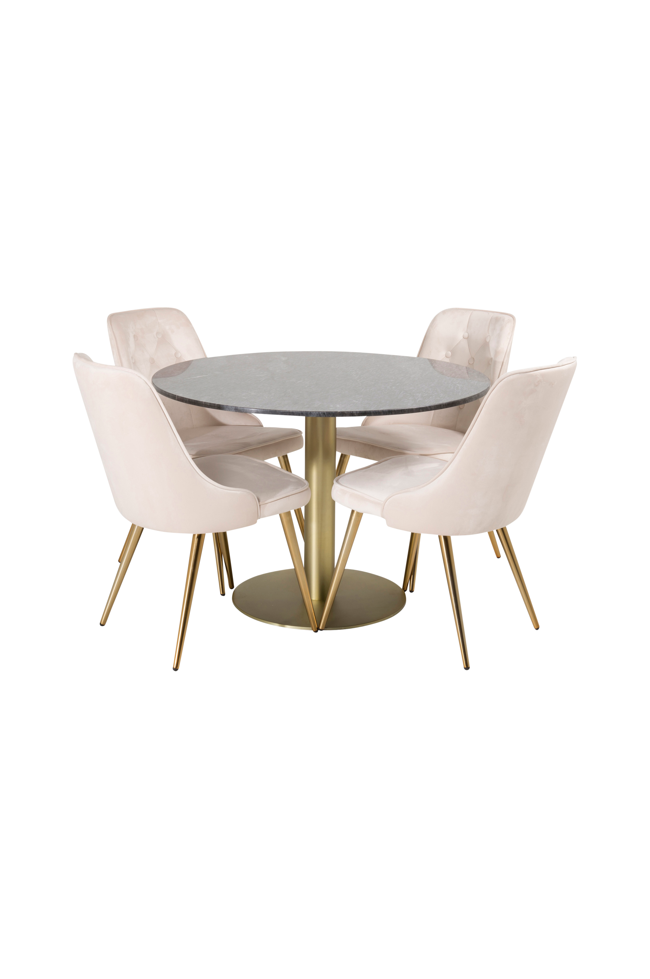 Espolla matgrupp, med ett modernt runt matbord med exklusiva materialval. Bords topp av äkta marmor och stativ i metall. Bordets mått; diameter 106, höjd 75 cm. Matchas med 4st eleganta stolar i sammet med mässingfärgade metall ben. Stolen mått; höjd 90, bredd 51, djup 63 cm. Sitthöjd 49 cm. Bordet och stolarna kräver enklare montering.